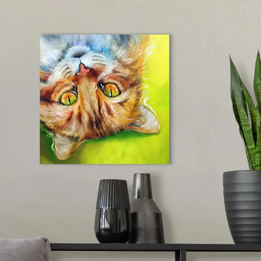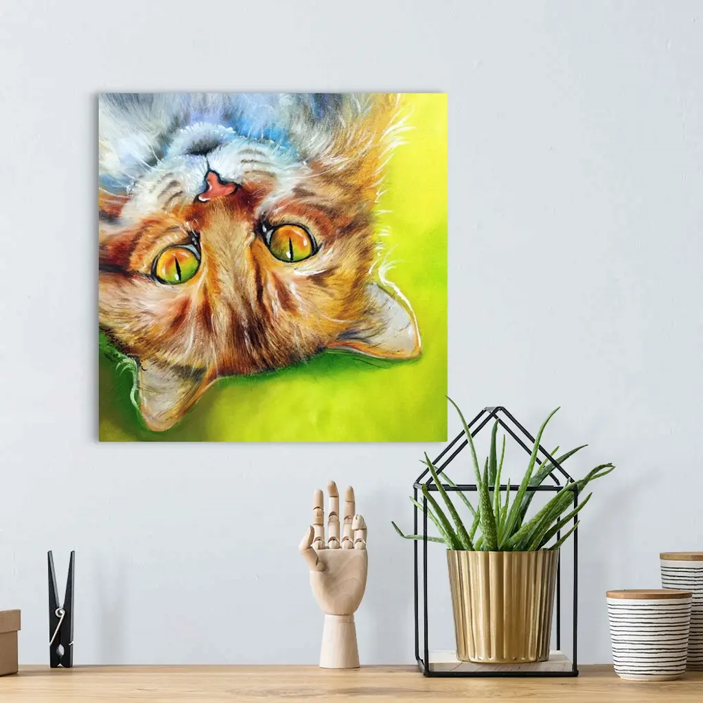 Square painting of an orange striped cat laying upside down on a bright green and yellow background.