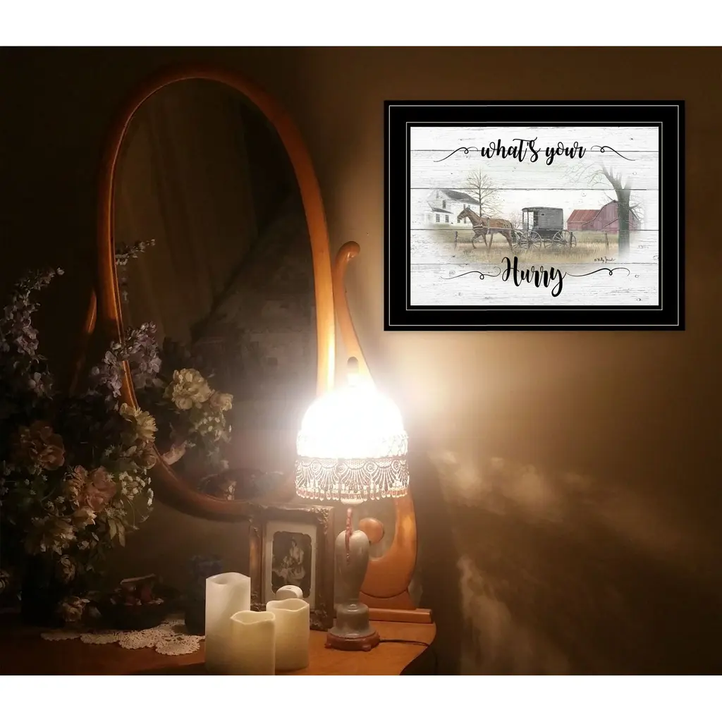 Add an air of fashion to your room and rejuvenate the space with this whats your hurry Amish buggy black framed print wall art. Bring a little bit of the farm indoors when you hang this horse artwork. This print is a visual artistic expression that allows you to decorate your space in style. Reproduced for you on paper, this hanging decorative accent will be a trendy and fashionable way to dress your walls. Hang on your wall to add some up to date fashion and decoration. Utilize this opportunity to create a focal point in the room with this fabulous wall decor option. 15" H x 19" W x 1" D