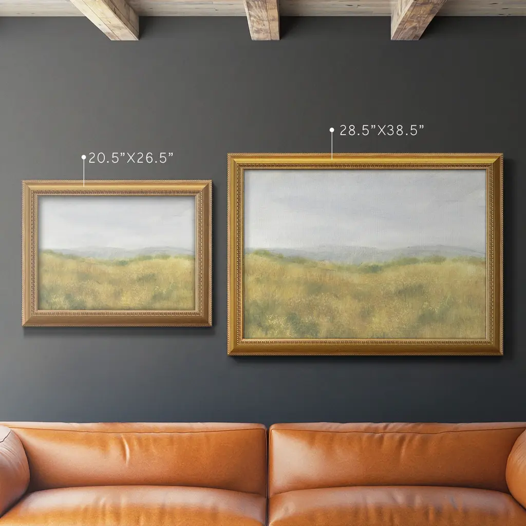 Wheat Fields I Premium Framed Canvas- Ready to Hang A Premium Framed Canvas created to last. Framed in distressed wood and available in an array of sizes and colors Featuring a beveled a solid wood stretcher bar, each piece comes ready to hand 3 SIZES AVAILABLE 16''X20'' - Overall Size 18'X27'' - Overall Size 24''x36'' - Overall Size Each piece is made to order. Each piece comes with hanging hardware. Made in the USA Ready to Hang Giclee Paper Print Acrylic Glass Beveled Matt Board