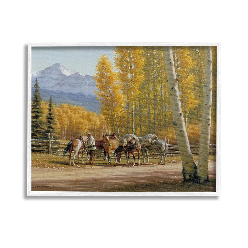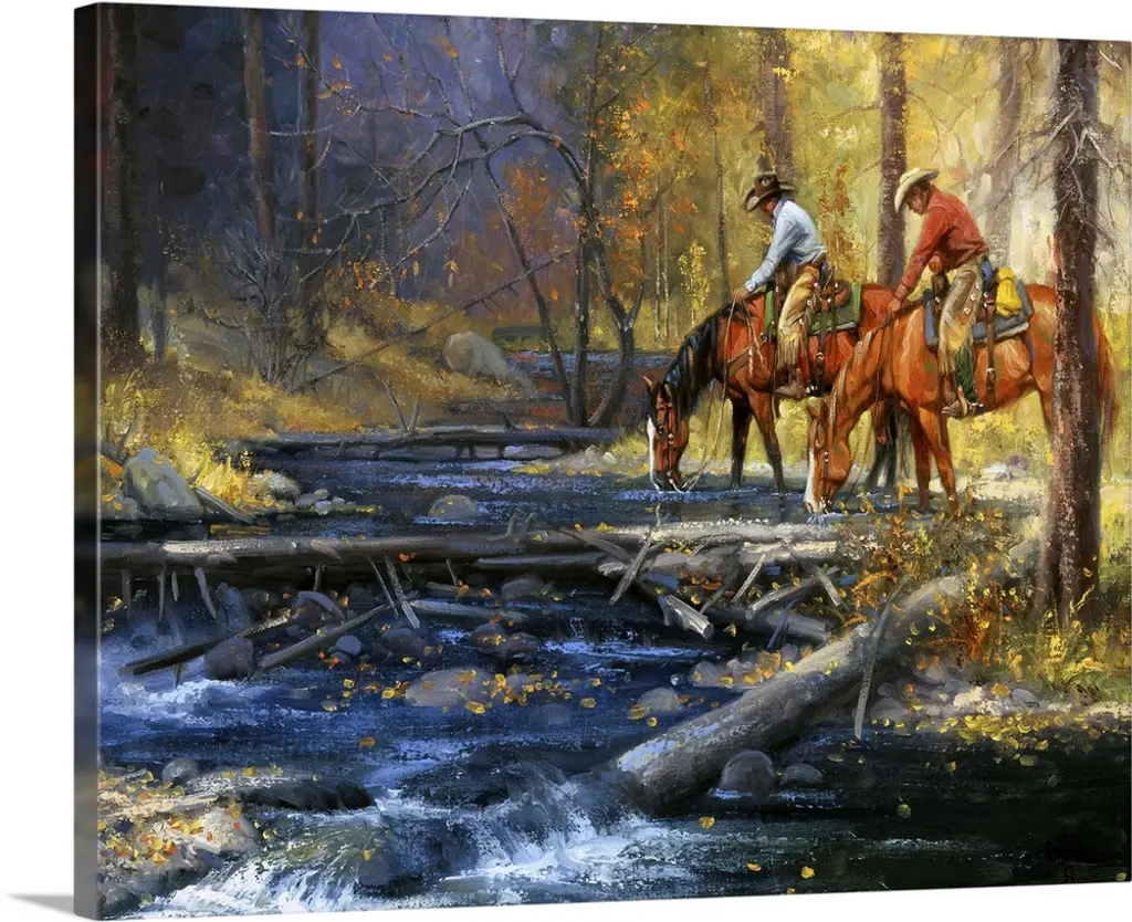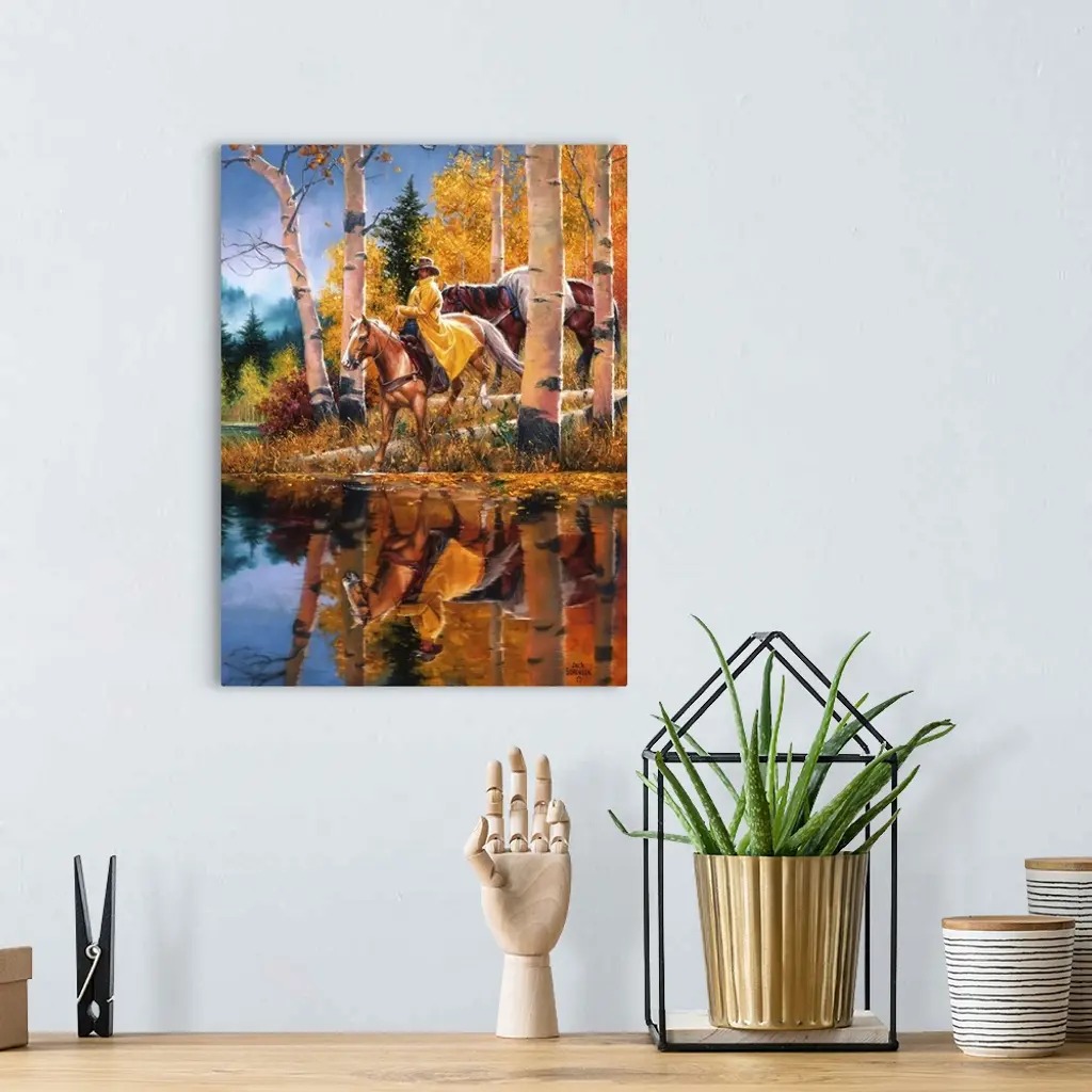 Contemporary Western artwork of a rider on horseback at a riverbank near some aspen trees in the fall.