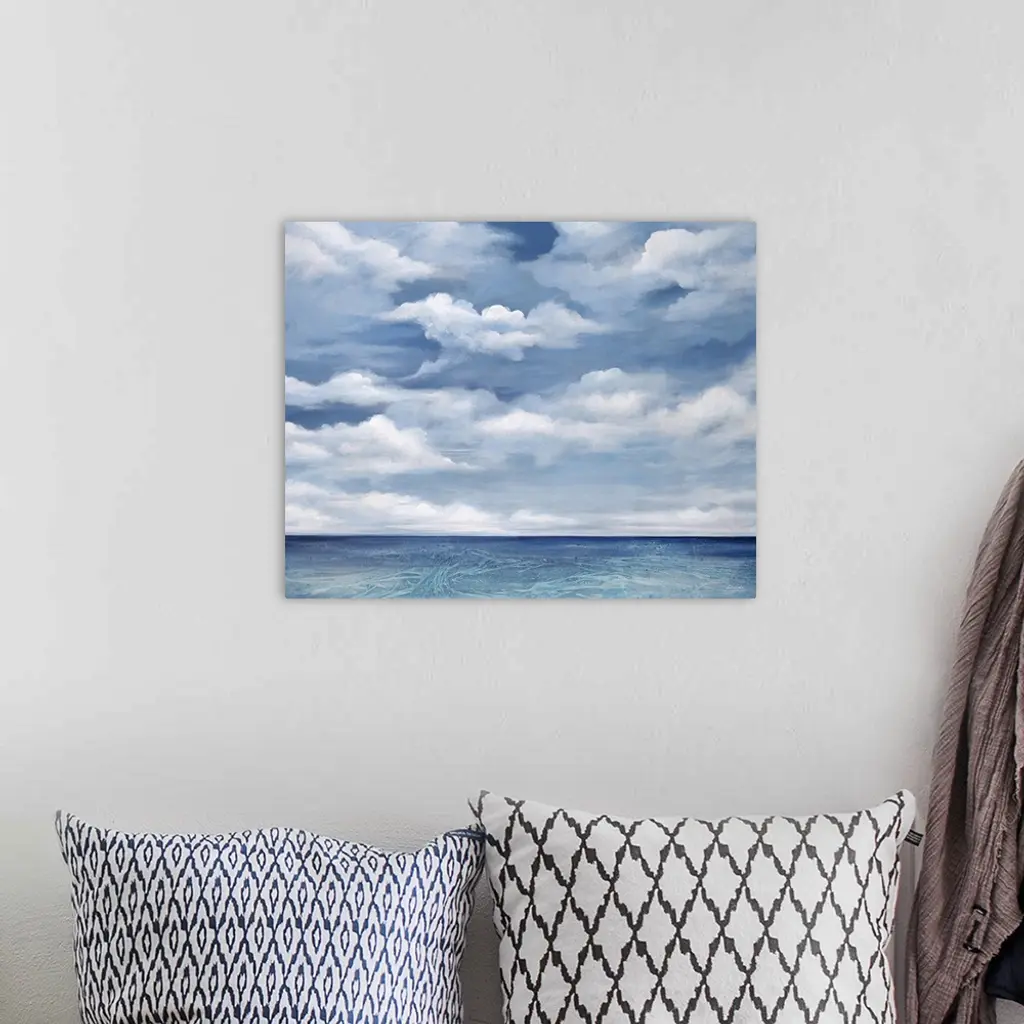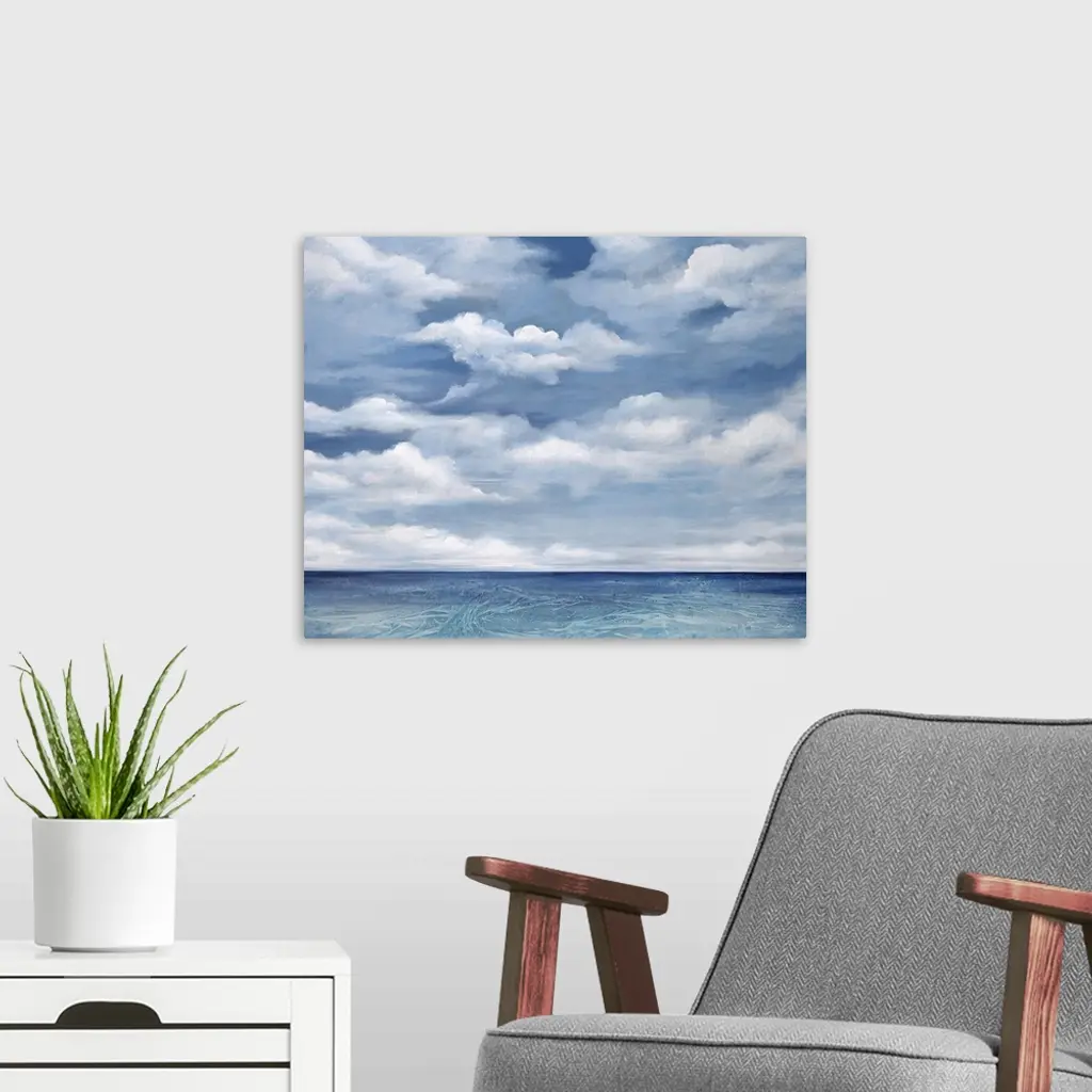Contemporary artwork of a serene ocean view with bright clouds above.