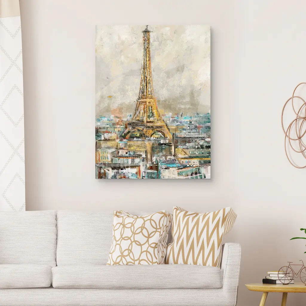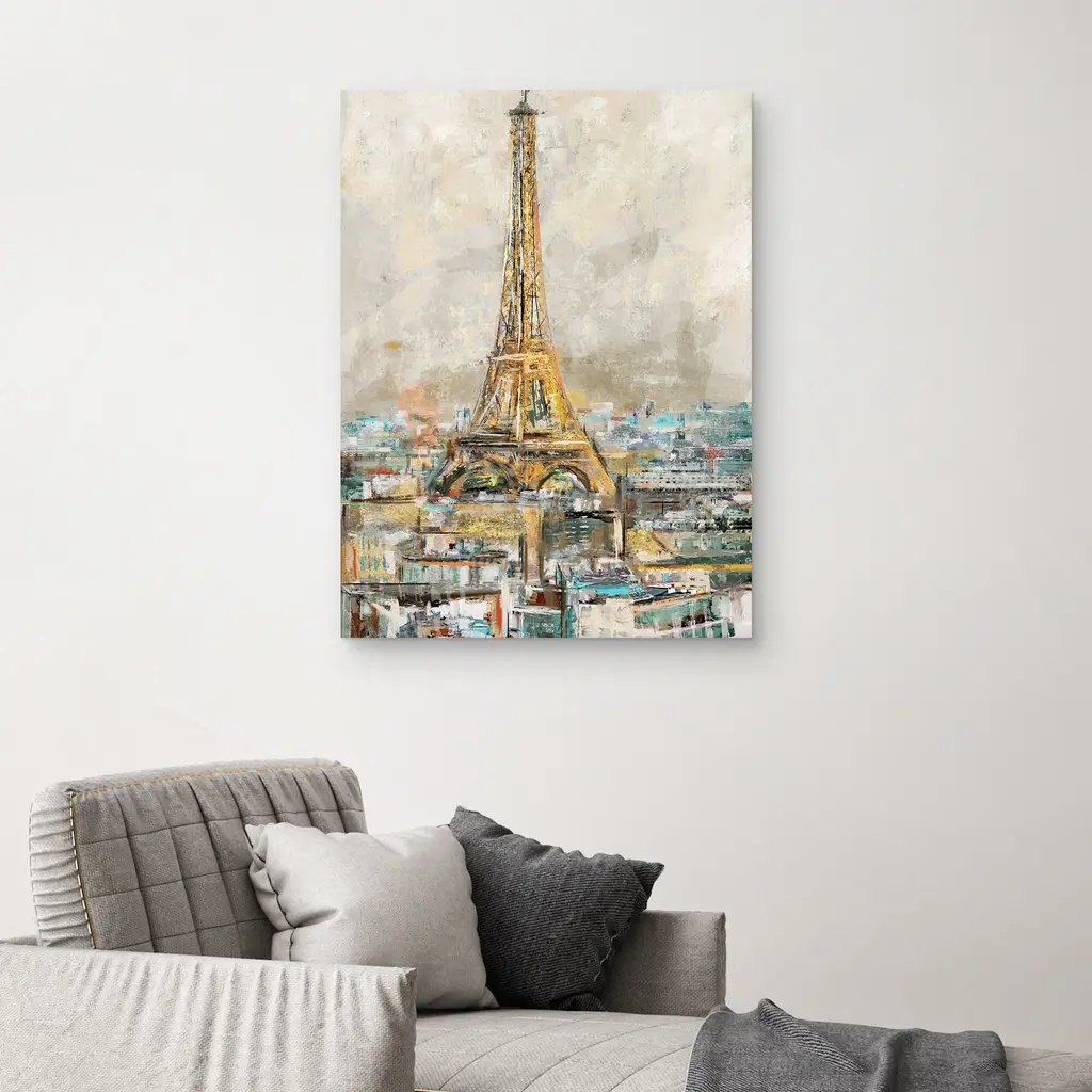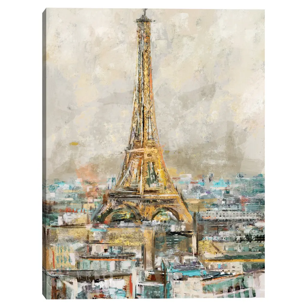 This globally celebrated tower of wrought iron lattice stands tall and proud amidst the enchanting city of Paris. Constructed in the late 1800s, the masterpiece of engineering wonder has become one of the most popular tourist destinations in the world. When in Paris by Studio Arts, canvas art print features the tower gilded in gold.