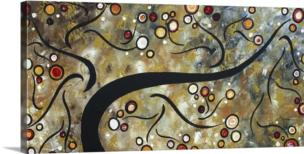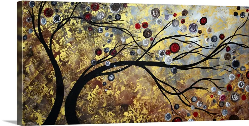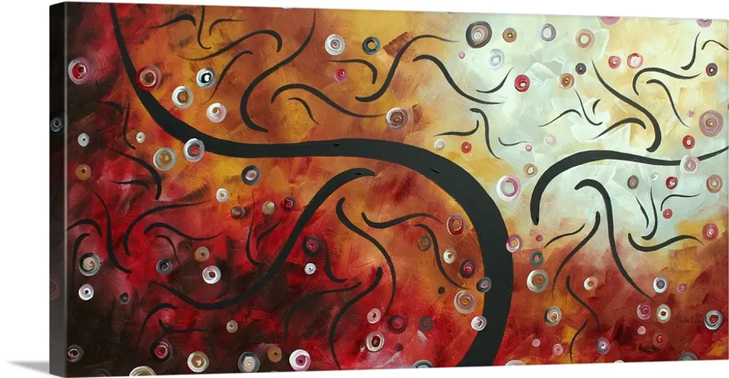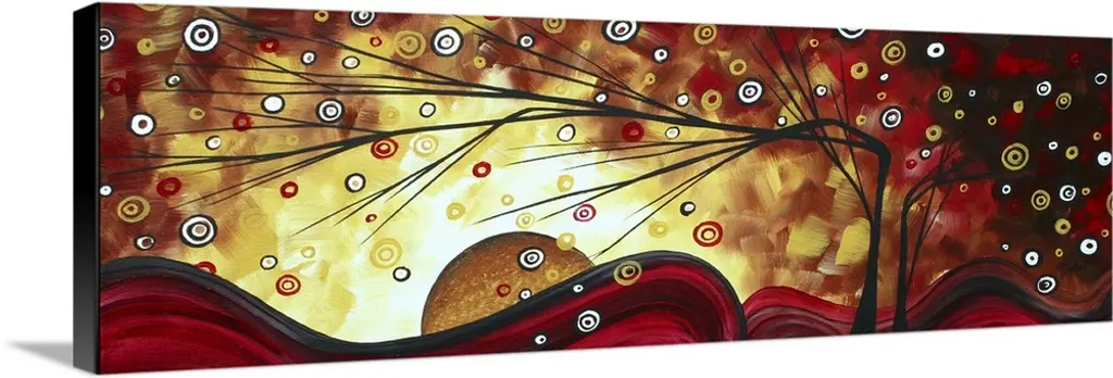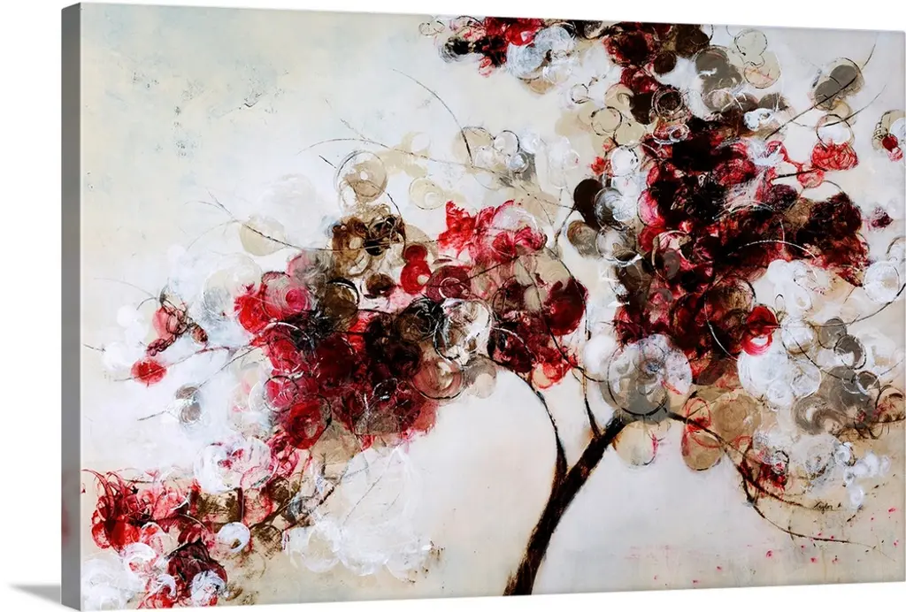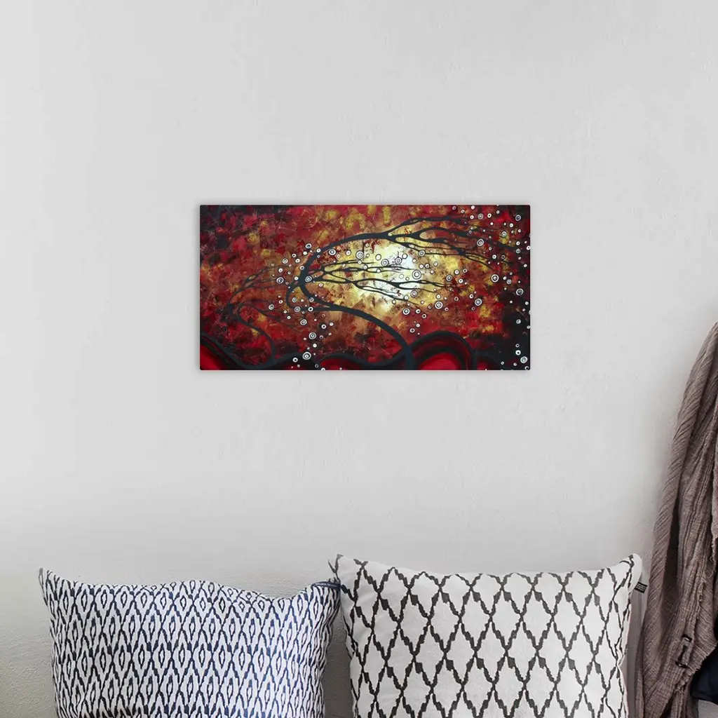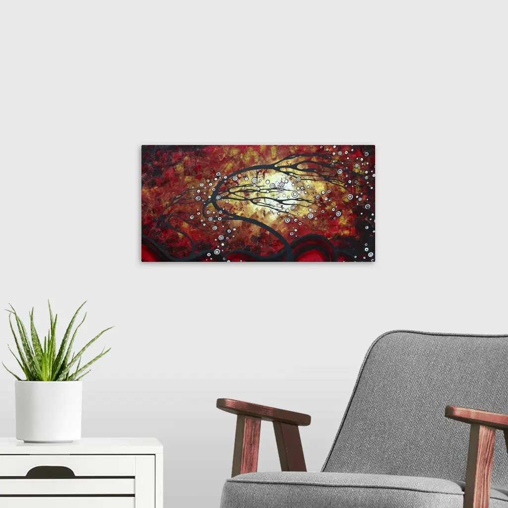 This decorative accent for the home or office is an abstract painting of a surreal tree bending in the wind in front of an ethereal glowing background.