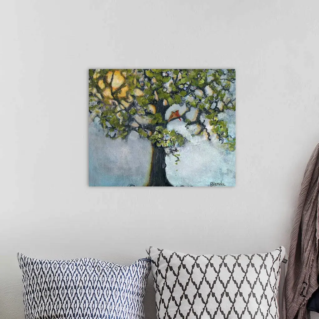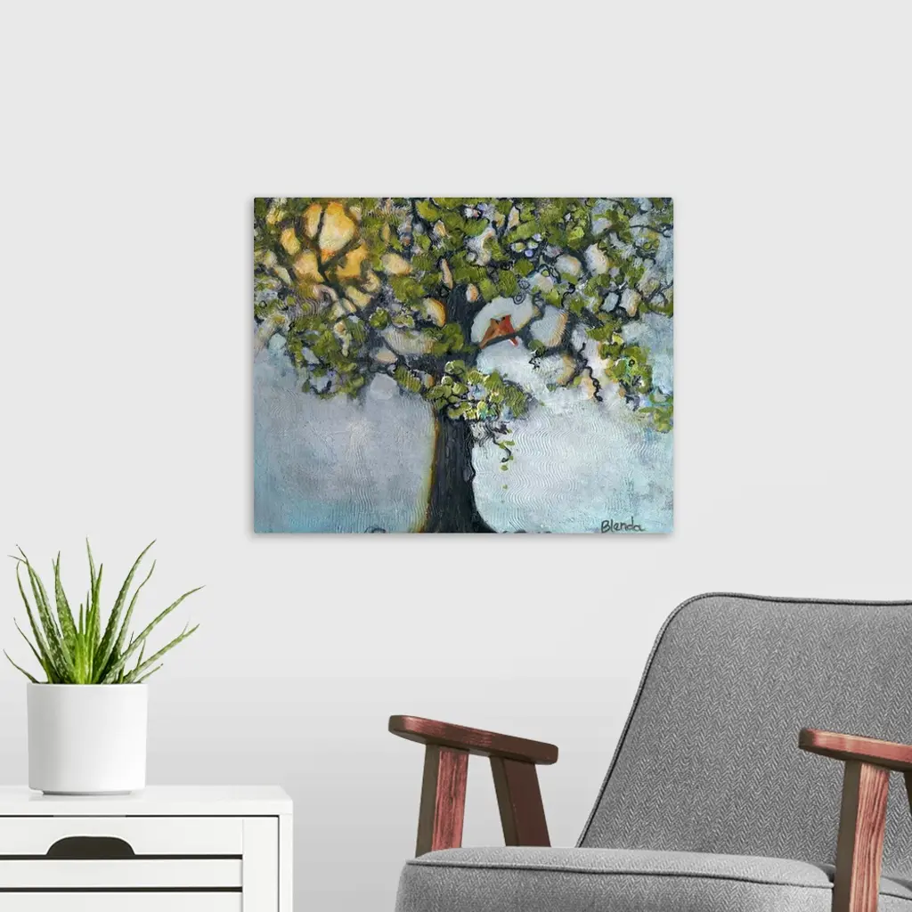 Lighthearted contemporary painting of a tree with birds perched on the on the branches.