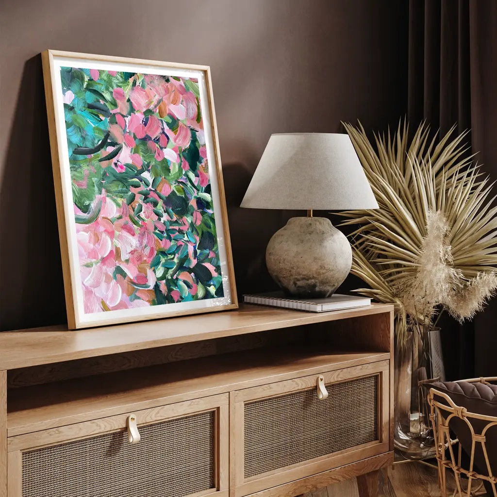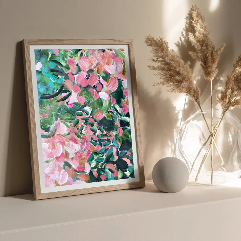 Inspired by tulips growing in spring, this abstract floral print combines vibrant greens with coral pinks, burnt oranges and rose pinks for a truly fresh and joyful piece. Expressive brushstrokes create a beautiful, nature-inspired print that adds tons of joy and colour to interior spaces where a dash of fun is desired. Printed on heavyweight 316gsm cotton rag textured paper using archival-quality inks, this giclée print will maintain its beautiful vibrancy for many years to come. Each print has a white border so it can easily fit into a standard size frame. Print is sold unframed.