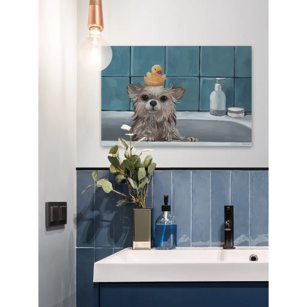 This little pup is having so much fun in his calm bath. He perks out of the water with a playful look and a rubber ducky on his head. Add this playfulness to your bathroom. Proudly made in the USA, this piece is printed on canvas before it's stretched over non-warping wooden bars for a gallery-wrapped look. With wall-mounting hooks included, this artful accent is ready to hang up as soon as it reaches your front door. • Fine art canvas print from the Marmont Hill Art Collective • Professionally hand stretched • Gallery wrapped in sustainable, non-warping wood • Arrives ready to hang • Made in the USA • Includes a certificate of authenticity