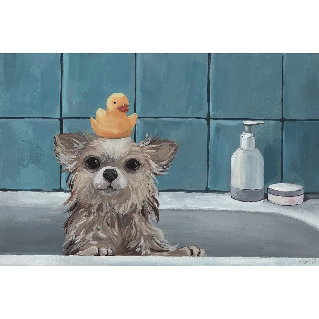 This little pup is having so much fun in his calm bath. He perks out of the water with a playful look and a rubber ducky on his head. Add this playfulness to your bathroom. Proudly made in the USA, this piece is printed on canvas before it's stretched over non-warping wooden bars for a gallery-wrapped look. With wall-mounting hooks included, this artful accent is ready to hang up as soon as it reaches your front door. • Fine art canvas print from the Marmont Hill Art Collective • Professionally hand stretched • Gallery wrapped in sustainable, non-warping wood • Arrives ready to hang • Made in the USA • Includes a certificate of authenticity