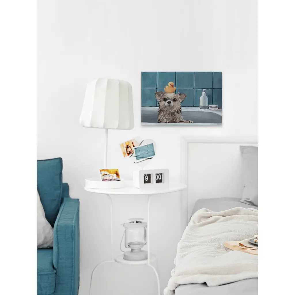 This little pup is having so much fun in his calm bath. He perks out of the water with a playful look and a rubber ducky on his head. Add this playfulness to your bathroom. Proudly made in the USA, this piece is printed on canvas before it's stretched over non-warping wooden bars for a gallery-wrapped look. With wall-mounting hooks included, this artful accent is ready to hang up as soon as it reaches your front door. • Fine art canvas print from the Marmont Hill Art Collective • Professionally hand stretched • Gallery wrapped in sustainable, non-warping wood • Arrives ready to hang • Made in the USA • Includes a certificate of authenticity