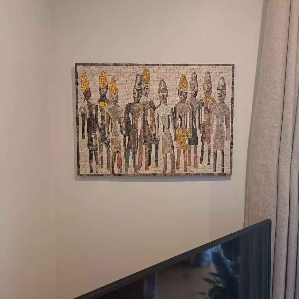 Introducing our Whimsical Phoenician Figures Mosaic Art, a stunning decorative masterpiece that infuses artistry and history into any space. Handcrafted with meticulous care from premium natural stone, this exquisite marble mosaic ensures each piece is uniquely radiant and of the highest quality. The artwork vividly portrays whimsical expressionistic Phoenician figures, capturing the playful spirit and rich cultural heritage of the Phoenician civilization. What truly distinguishes this mosaic is the incorporation of shimmering gold leaf tiles within the figures, adding a captivating shimmer that elevates the overall aesthetic and creates a dazzling visual contrast against the natural stone tones. Among its luxurious elements, the mosaic features rare Blue Bahia stones, prized for their exotic Brazilian blue hues and oceanic brilliance. These deep cerulean and tropical blue luxury tones bring a jewel-like, prismatic radiance that enchants the eye and adds an unparalleled depth and cool, silky texture to the composition. Perfect for any room—whether a living area, hallway, or as a centerpiece in a curated art collection—this piece transcends decoration to become a statement of tradition and innovation. Fully handmade, each mosaic reflects the artisan's dedication to impeccable craftsmanship, showcasing intricate details and vibrant colors that celebrate the timeless allure of mosaic art. With its whimsical themes and historical significance, this artwork beckons those who cherish culture and creativity. Bring home the charm of the past with the Whimsical Phoenician Figures Mosaic Art and transform your space into a gallery of history and imagination. Ideal as a gift for discerning art lovers or an exceptional addition to your own collection, this mosaic is both a visual delight and a captivating conversation starter. Elevate your decor today with this enchanting artwork that seamlessly blends whimsy and luxury stone artistry in every radiant shard.