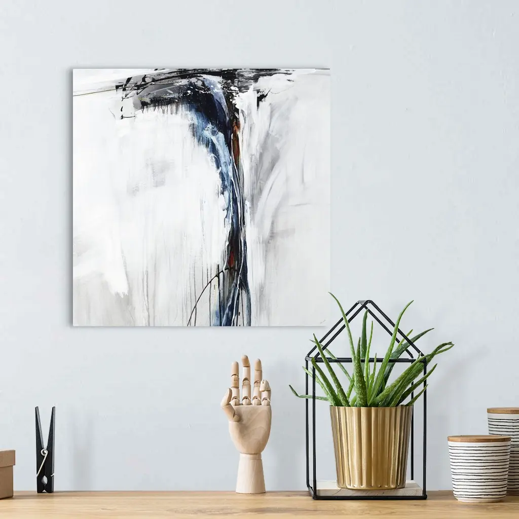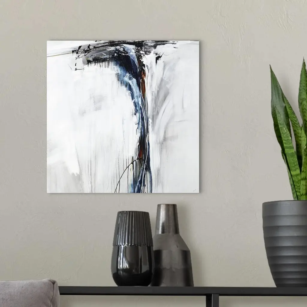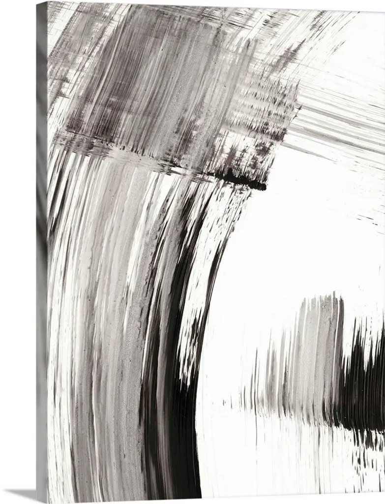 An energetic blend of sweeping strokes of colors in the center of the artwork.