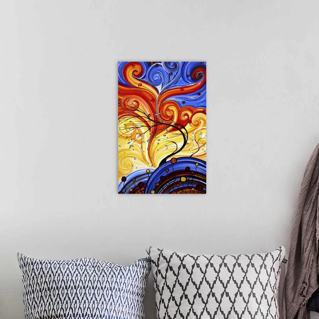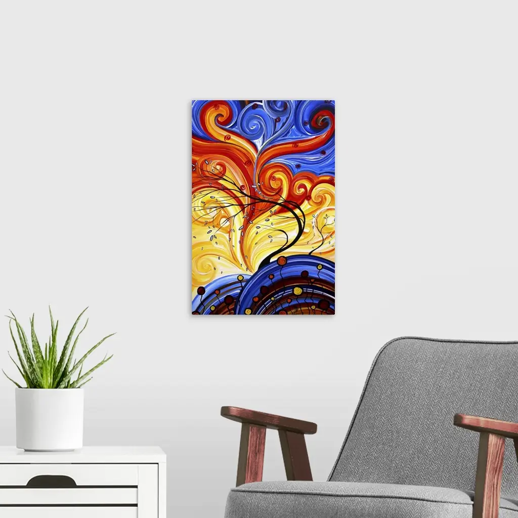Bright and rich colorful contemporary abstract painting of trees blowing in wind with leaves falling and swirls of colorful in the background.