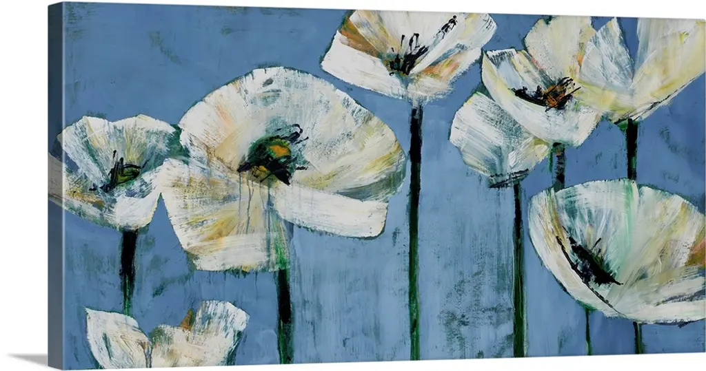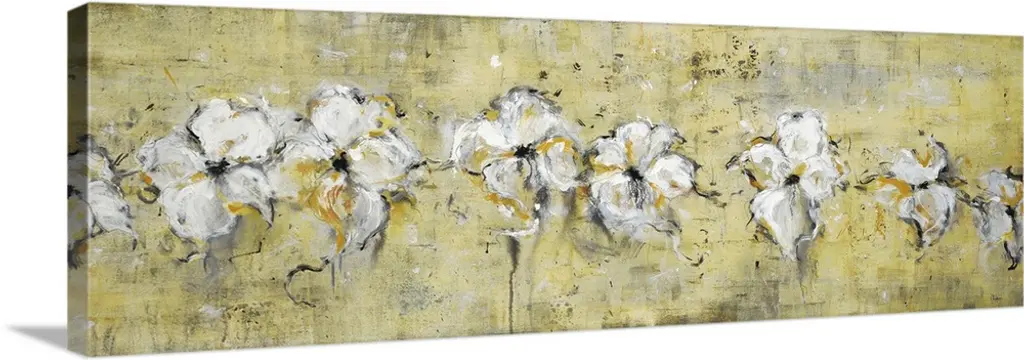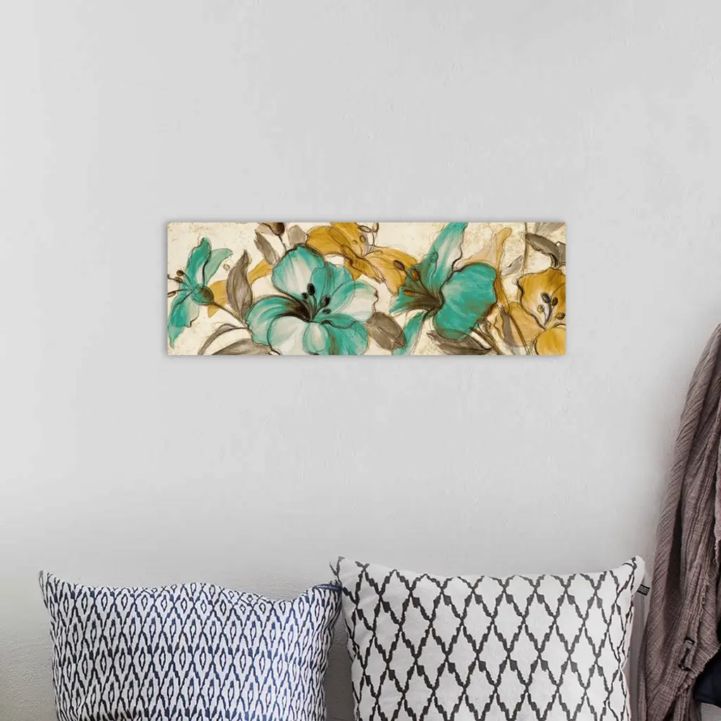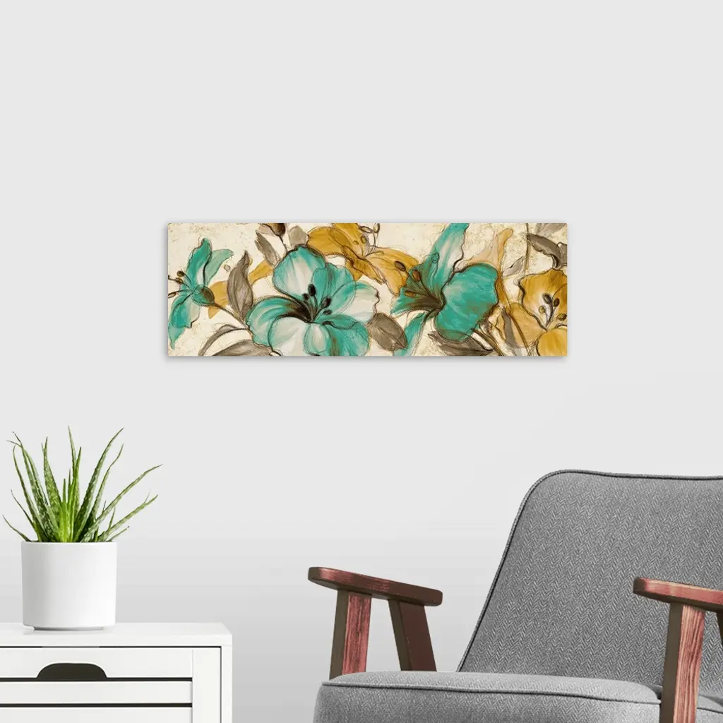 Horizontal, large artwork for a living room or office of big, colorful flowers illustrated on a neutral background.