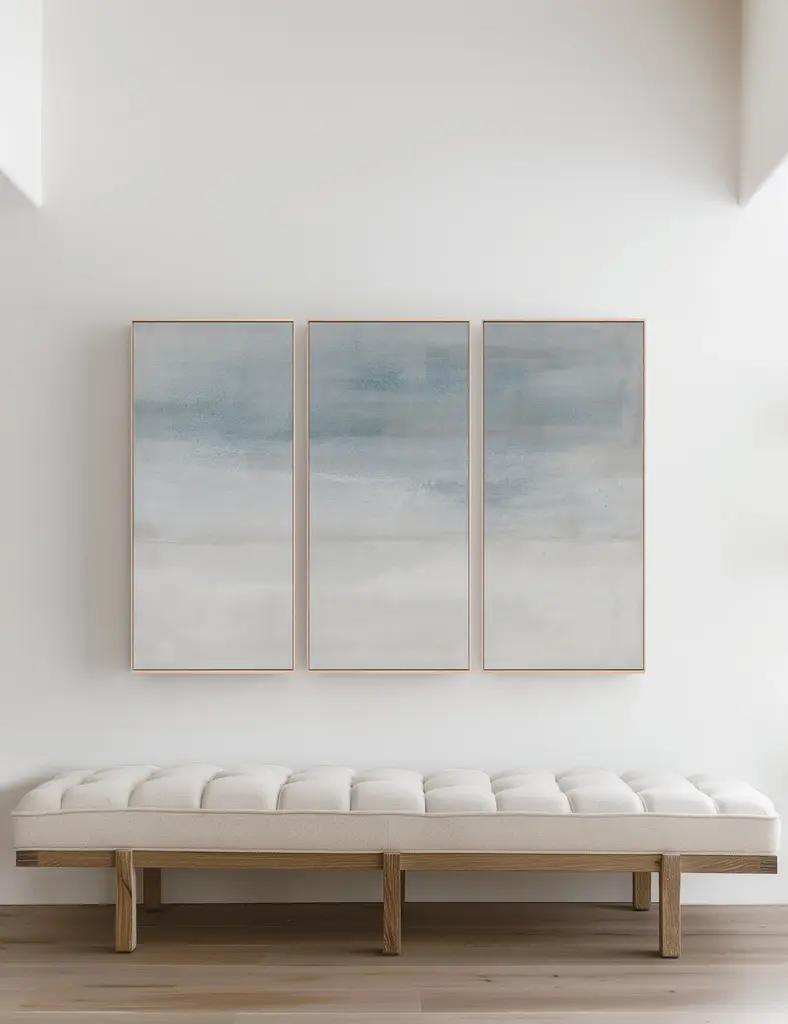 This abstract artwork by Carol Benson-Cobb captures a serene, atmospheric scene with its calming palette of grays and blues. We love this triptych as an elevating addition to a refined wall art curation.