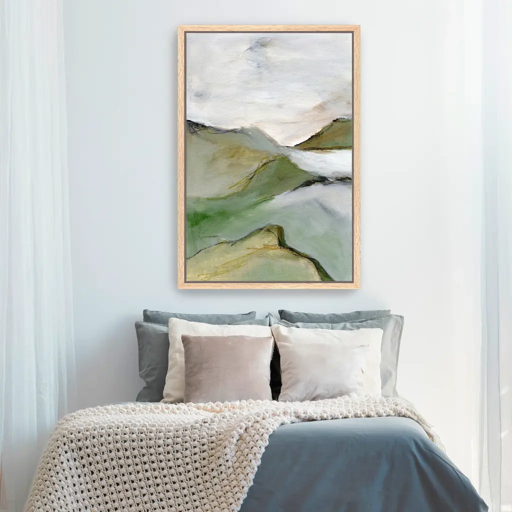 This tranquil landscape canvas print captures the quiet beauty of rolling hills, misty meadows, or forest silhouettes in muted green and beige hues. Perfect for adding a touch of natural elegance to modern or rustic interiors. Our Gallery Wrap Canvas Prints are proudly assembled with high quality materials in California, USA. Each piece is printed on a thick, archival grade canvas using Giclee technology. It is then hand-stretched by our experienced artisans over solid wood bars, which will not warp over time. The final product is a piece personally crafted for you to confidently display on your wall. Care and Assembly: Ensure that the location of your piece has little to no exposure to heat, sunlight, and moisture. Wipe clean, only if needed. Each piece includes hanging hardware to hang on your wall vertically.