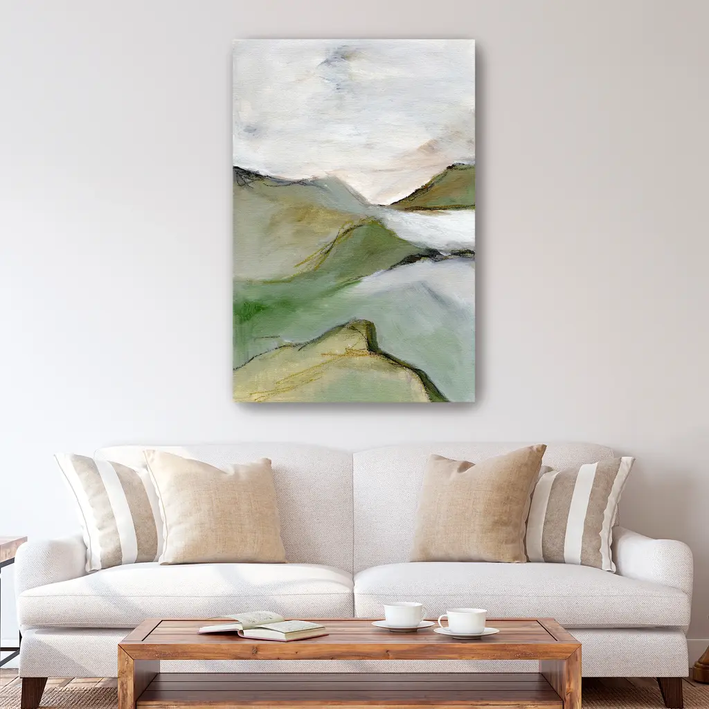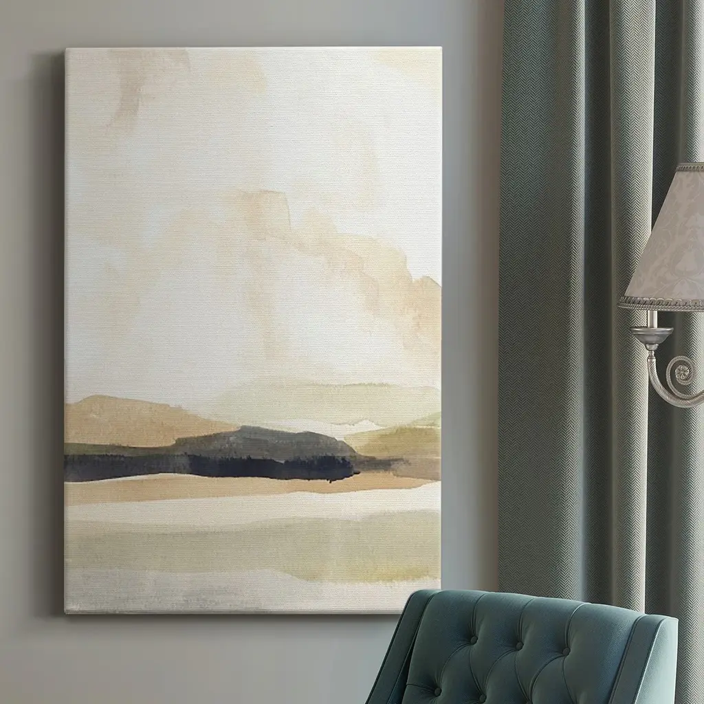 This tranquil landscape canvas print captures the quiet beauty of rolling hills, misty meadows, or forest silhouettes in muted green and beige hues. Perfect for adding a touch of natural elegance to modern or rustic interiors. Our Gallery Wrap Canvas Prints are proudly assembled with high quality materials in California, USA. Each piece is printed on a thick, archival grade canvas using Giclee technology. It is then hand-stretched by our experienced artisans over solid wood bars, which will not warp over time. The final product is a piece personally crafted for you to confidently display on your wall. Care and Assembly: Ensure that the location of your piece has little to no exposure to heat, sunlight, and moisture. Wipe clean, only if needed. Each piece includes hanging hardware to hang on your wall vertically.