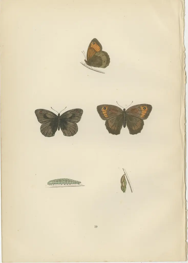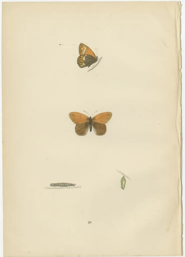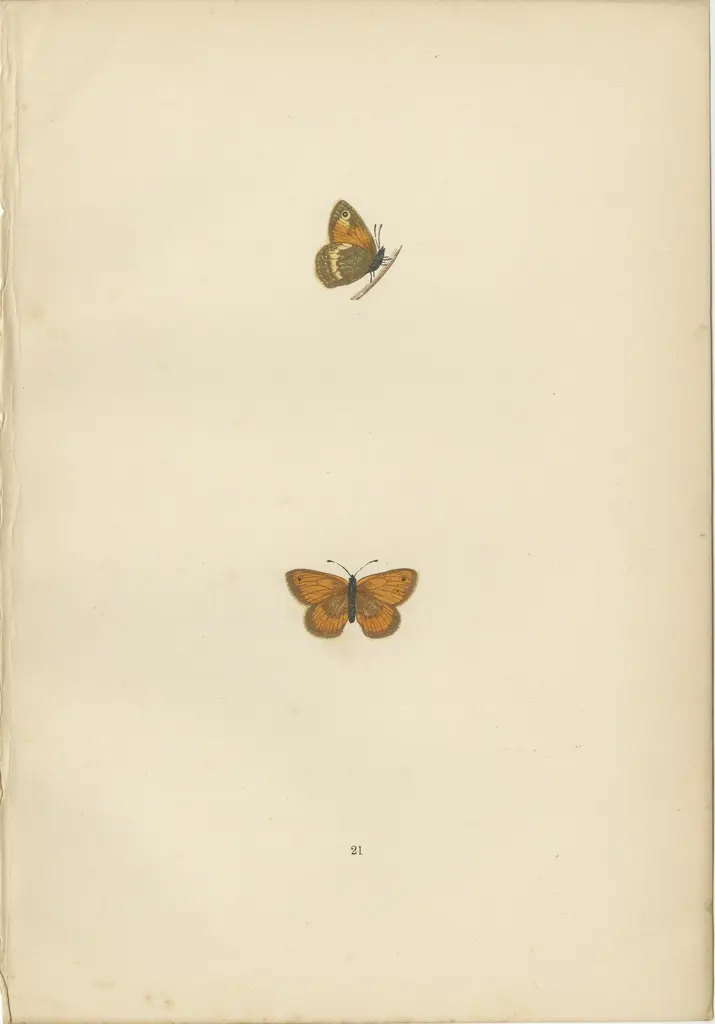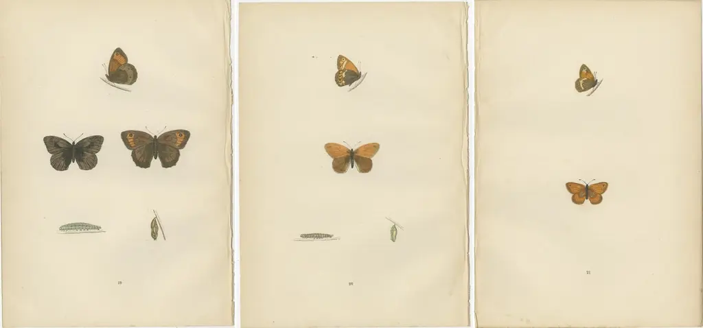 The butterflies presented in these hand-colored plates from the 1890 edition of 'A History of British Butterflies' by Morris include:1. Large Meadow Brown (likely Maniola jurtina) - This butterfly typically showcases wings that are a rich, tawny brown color. The males usually have a single, prominent eyespot on the forewing, whereas the females may have several, more discreet ones. This species is interesting because of its widespread nature and adaptability to various habitats, often found in grassy meadows throughout Europe.2. Heath Butterfly (likely Coenonympha pamphilus, also known as the Small Heath) - The Small Heath is a small butterfly with a wingspan of about 30 mm. It's characterized by its understated yet elegant coloration: earthy browns with eye-catching eye spots on the wings and subtle orange patches. This butterfly is compelling for its behavior of flying low to the ground and its tendency to rest with its wings closed, revealing the camouflaged undersides that blend with the grassy environment.3. Least Meadow Brown (this is a less common name, possibly an older term for a known species or a variation of the Small or Common Meadow Brown, which could refer to various species in the Maniola or Hyponephele genus) - If this refers to a smaller species or subspecies within the aforementioned genera, it would be characterized by its smaller size and perhaps more delicate features. The interest in such species often lies in their specific habitat requirements and behaviors, which can be crucial for understanding biodiversity and conservation needs.What makes these butterflies particularly interesting is their ability to adapt to the environmental conditions of meadows and grasslands, as well as their contributions to the ecosystem as pollinators. Their varying levels of commonness or rarity also provide insights into the health of their habitats. The hand-colored plates themselves serve as historical artifacts, showcasing the meticulous art of natural history illustration and the endeavor to catalog and understand biodiversity during the period of publication.