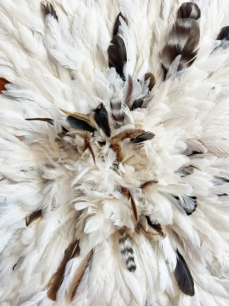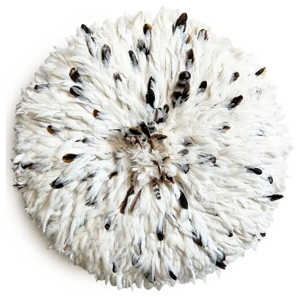 Beautiful hand crafted original JuJu hat wall art. Fresh white feathers black/brown speckled in. These attractive bird feather art form were originally worn as a headdress by dignitaries, chiefs, and the royal families also wear these ceremonial hats as a symbol of prosperity and wealth. Created from woven natural or brightly colored dyed wild chicken feathers then tied to straps and pulled open into a stunning circular display.