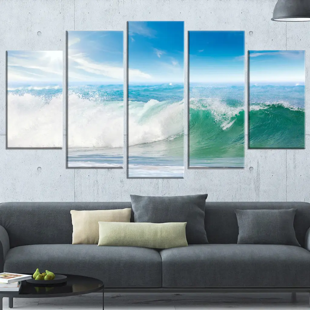 "White And Blue Waves Under Sun" Canvas Print, 5 Panels