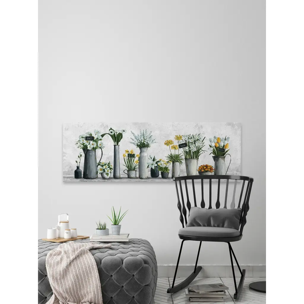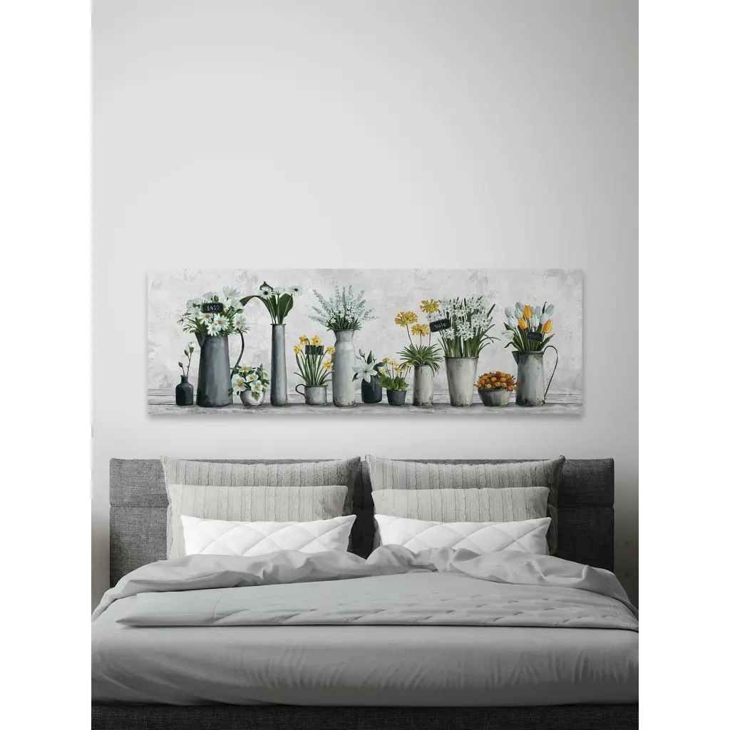 Make your space bright and welcoming with this acrylic painting print that features various potted white and yellow flower arrangements. Proudly made in the USA, this piece is printed on canvas before it's stretched over non-warping wooden bars for a gallery-wrapped look. With wall-mounting hooks included, this artful accent is ready to hang up as soon as it reaches your front door. Canadian artist, Parvez Taj uses water paints, photographs, software, and UV cured inks to create his wall art. His artwork connects the out-of-reach luxury art world with the modern, fashion-conscious home decorator by delivering high quality artwork that is both affordable and hip. • Fine art canvas print by Parvez Taj • Professionally hand stretched • Gallery wrapped in sustainable, non-warping wood • Arrives ready to hang • Made in the USA • Includes a certificate of authenticity • Artist signature on the front