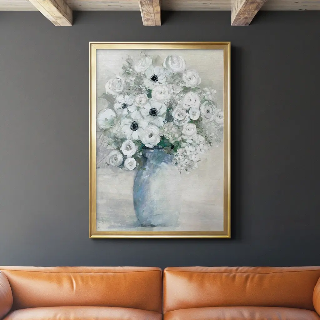 White Anemone Bouquet Premium Framed Print - Ready to Hang A Premium Framed Print created to last. Framed in distressed wood and available in an array of sizes and colors Featuring a beveled a solid wood stretcher bar, each piece comes ready to hand 4 SIZES AVAILABLE 30.5''X42.5'' - Overall Size 26.5'X36.5'' - Overall Size 22.5''x30.5'' - Overall Size 18.5''x24.5'' - Overall Size Each piece is made to order. Each piece comes with hanging hardware. Made in the USA Ready to Hang