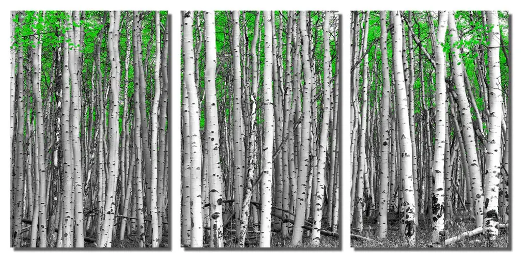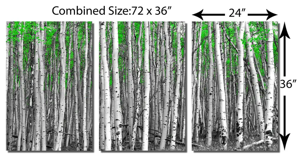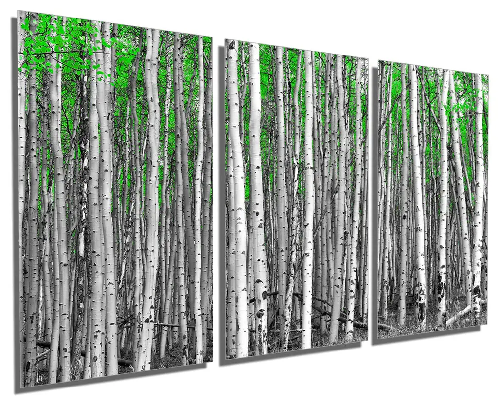 72" x 36" total size. Ready To Hang! (3 pieces - 24" x 36" each). 3 Panel Split (Triptych) Metal Print featuring White Aspen Trees with green color leaves. Modern metal wall art for home or office wall decor & interior design. Printed on Luxurious, HD aluminum glossy metal panels. Multi panel art.. HD aluminum panels. Metal print wall art. Includes Shadow Wall Mount on the back.• Aluminum Metal Wall Art• Made in USA• Ready to hang - No assembly required• Shadow mount hardware on the back• 0.045" thick HD Aluminum Panels• Scratch resistant, glossy finish• Superb color clarity, luxurious prints• Epson printing process• For indoor or moisture rich environment use• Easy to clean. Gently wipe with microfiber cloth.