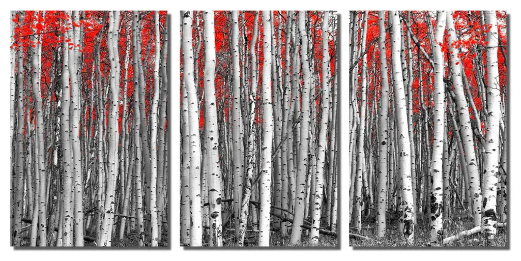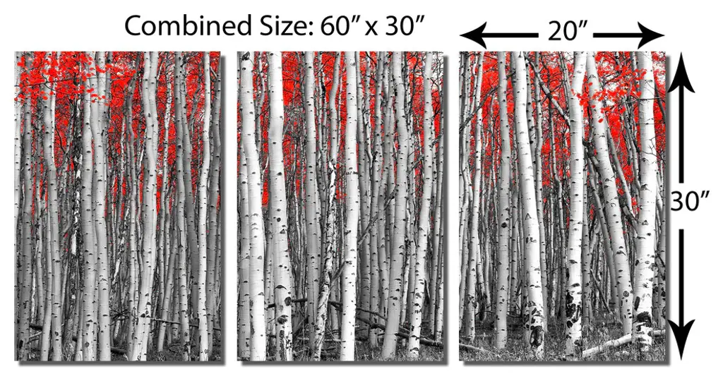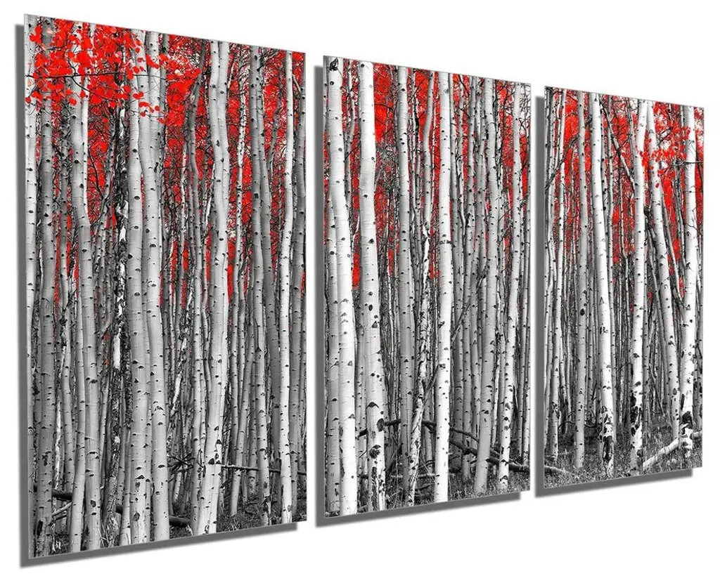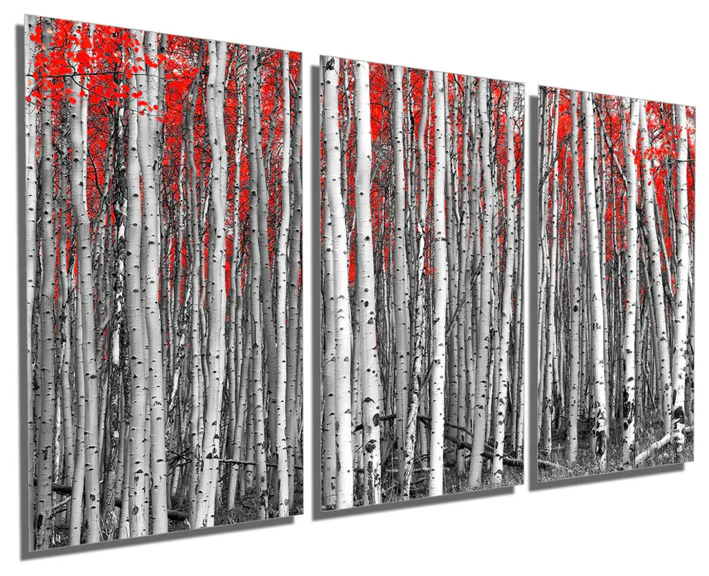 60" x 30" total size. Ready To Hang! (3 pieces - 20" x 30" each). 3 Panel Split (Triptych) Metal Print featuring White Aspen Trees with red color leaves. Modern metal wall art for home or office wall decor & interior design. Printed on Luxurious, HD aluminum glossy metal panels. Multi panel art.. HD aluminum panels. Metal print wall art. Includes Shadow Wall Mount on the back.• Aluminum Metal Wall Art• Made in USA• Ready to hang - No assembly required• Shadow mount hardware on the back• 0.045" thick HD Aluminum Panels• Scratch resistant, glossy finish• Superb color clarity, luxurious prints• Epson printing process• For indoor or moisture rich environment use• Easy to clean. Gently wipe with microfiber cloth.