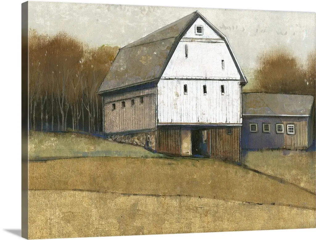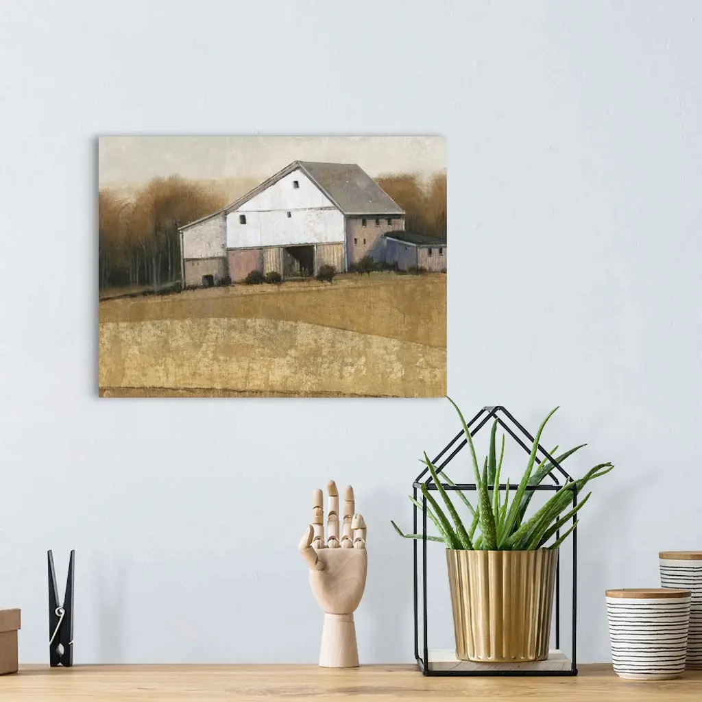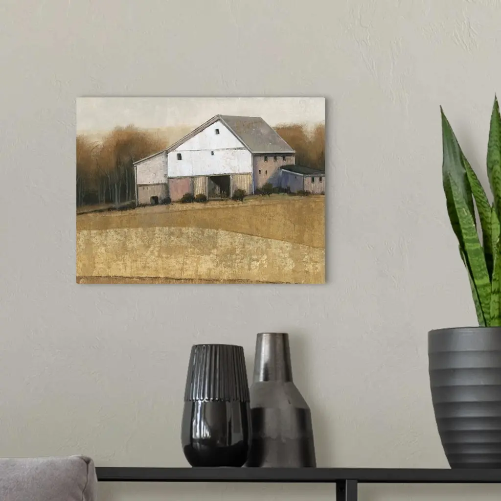 A painting of a simple countryside farmhouse in muted colors with vertical lined texture throughout is in this contemporary artwork.