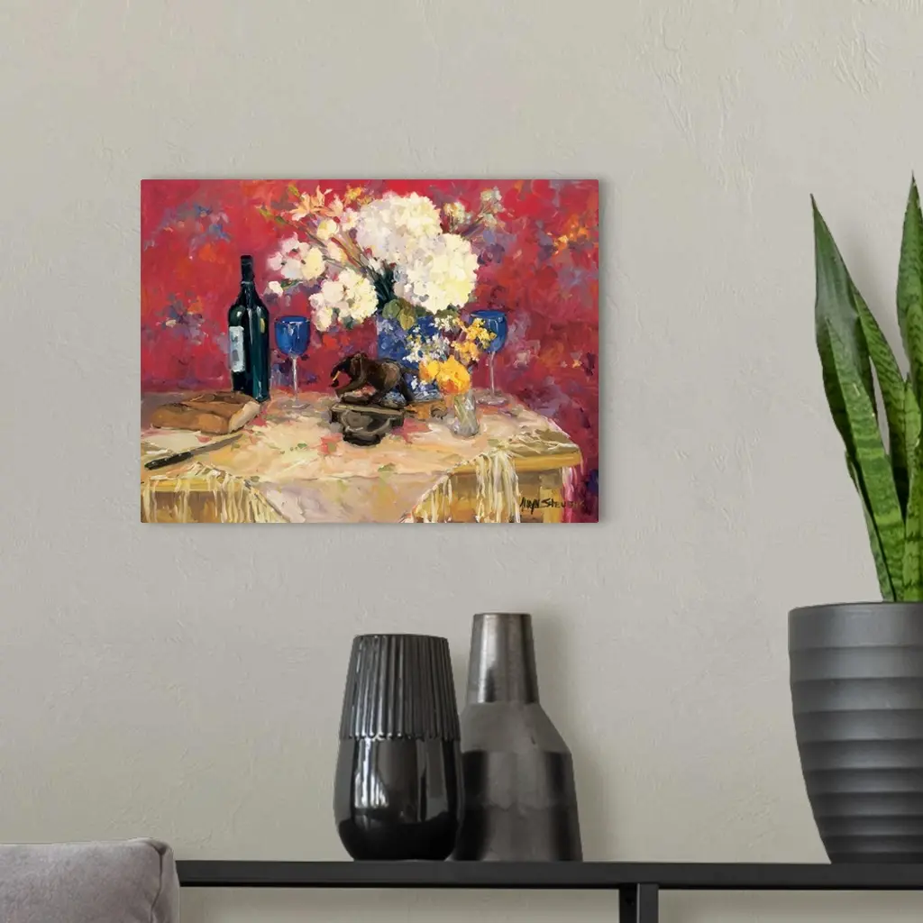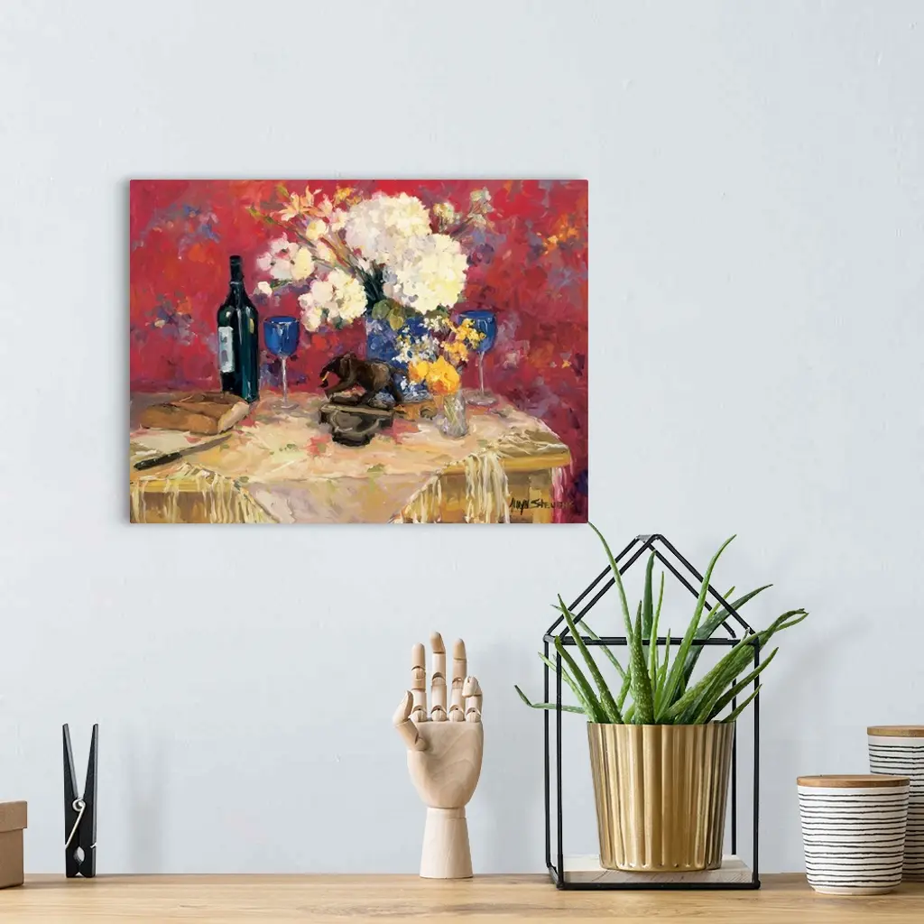 Fine art oil painting still life of wine and bread on table with a vase of white hydrangeas by Allayn Stevens.