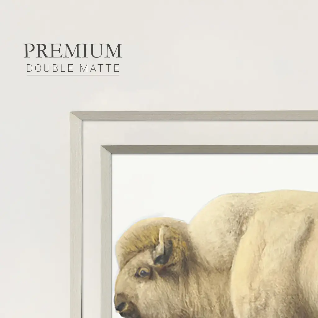 White BuffaloPremium Framed Print A framed cold pressed paper print featuring superior double matting and quality frame. 2 SIZES AVAILABLE 16''X16''' - Overall Size 20''X20''' - Overall Size Each piece is made to order. Each piece comes with hanging hardware. Made in the USA Ready to Hang Giclee Paper Print Plexiglass Beveled Matt Board Double Matte Board