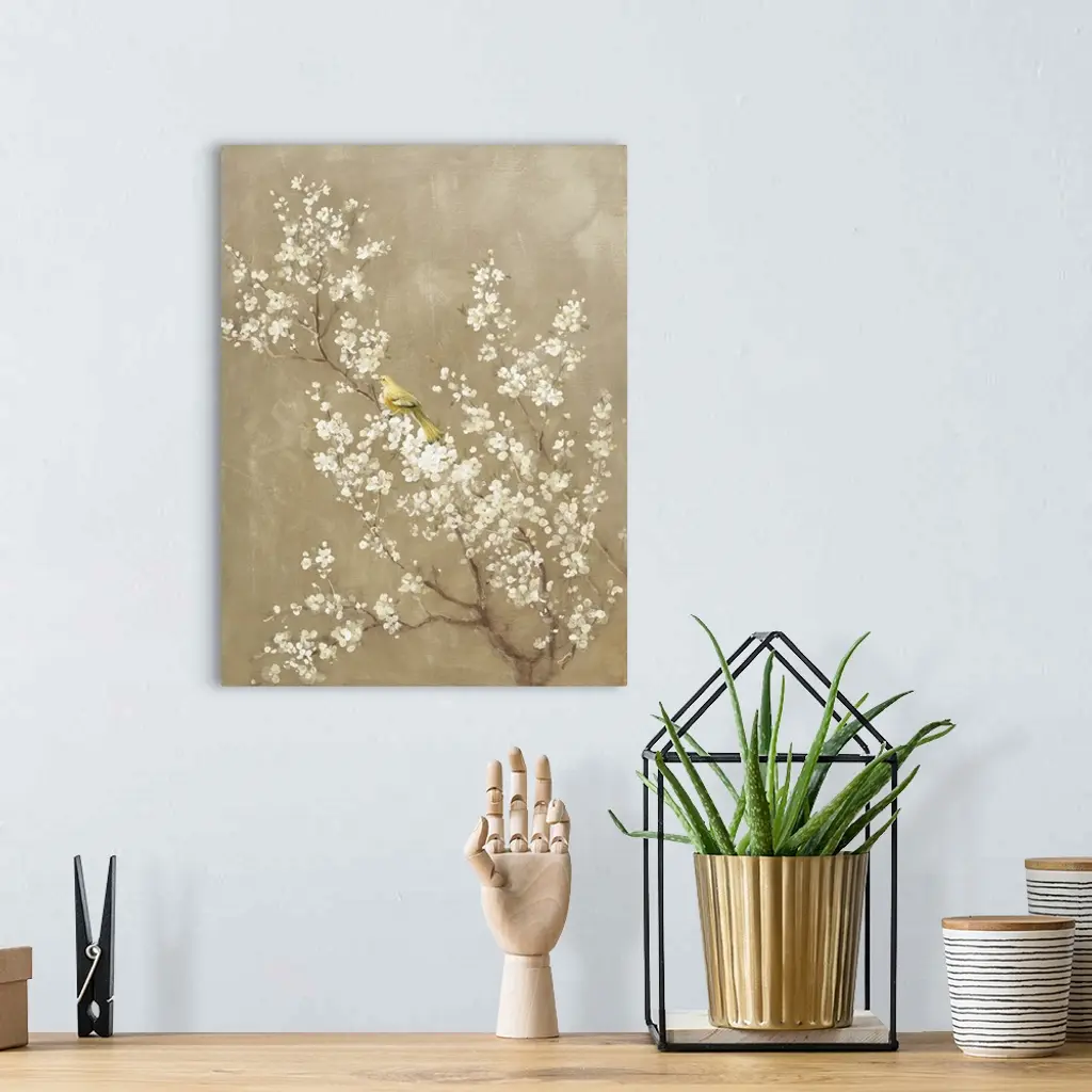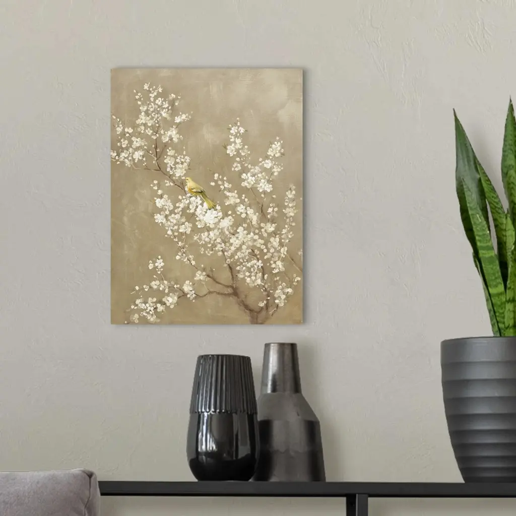 Painting of a yellow bird perched in a white cherry blossom tree with a beige background.