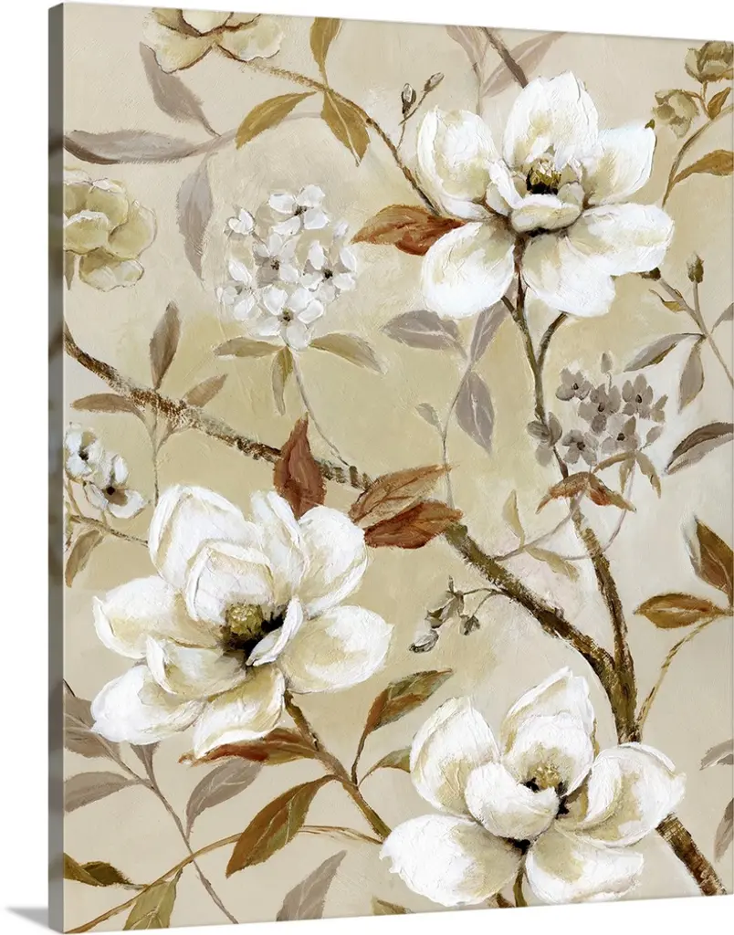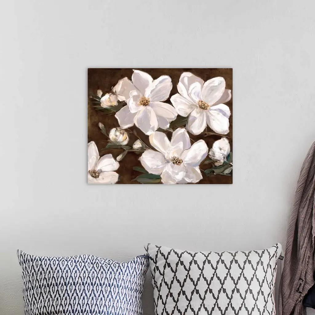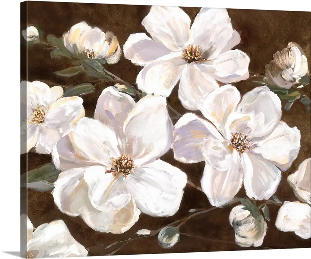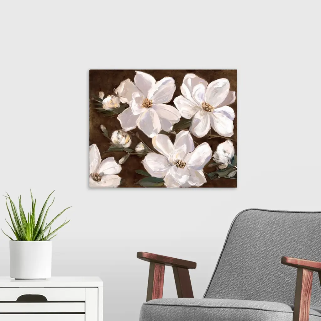 Contemporary painting of large white flowers with broad petals on a rich brown background.
