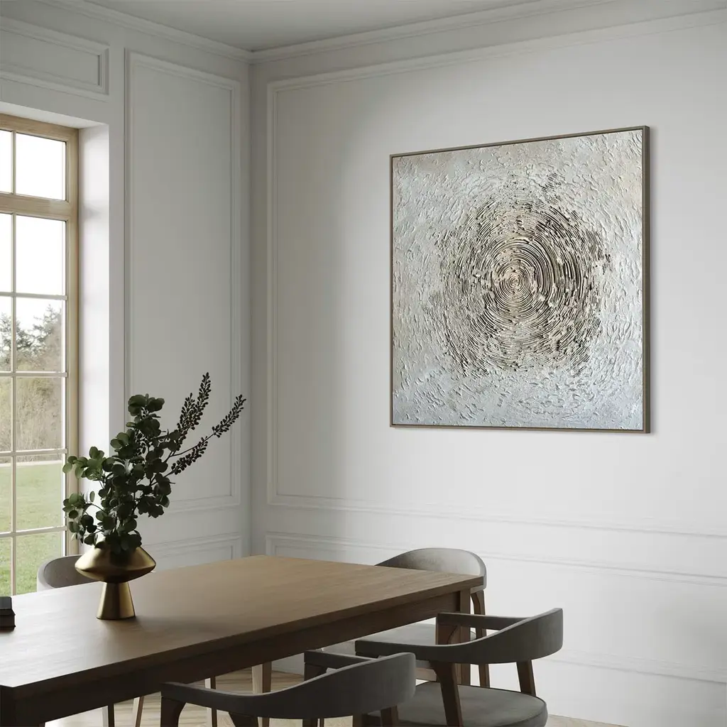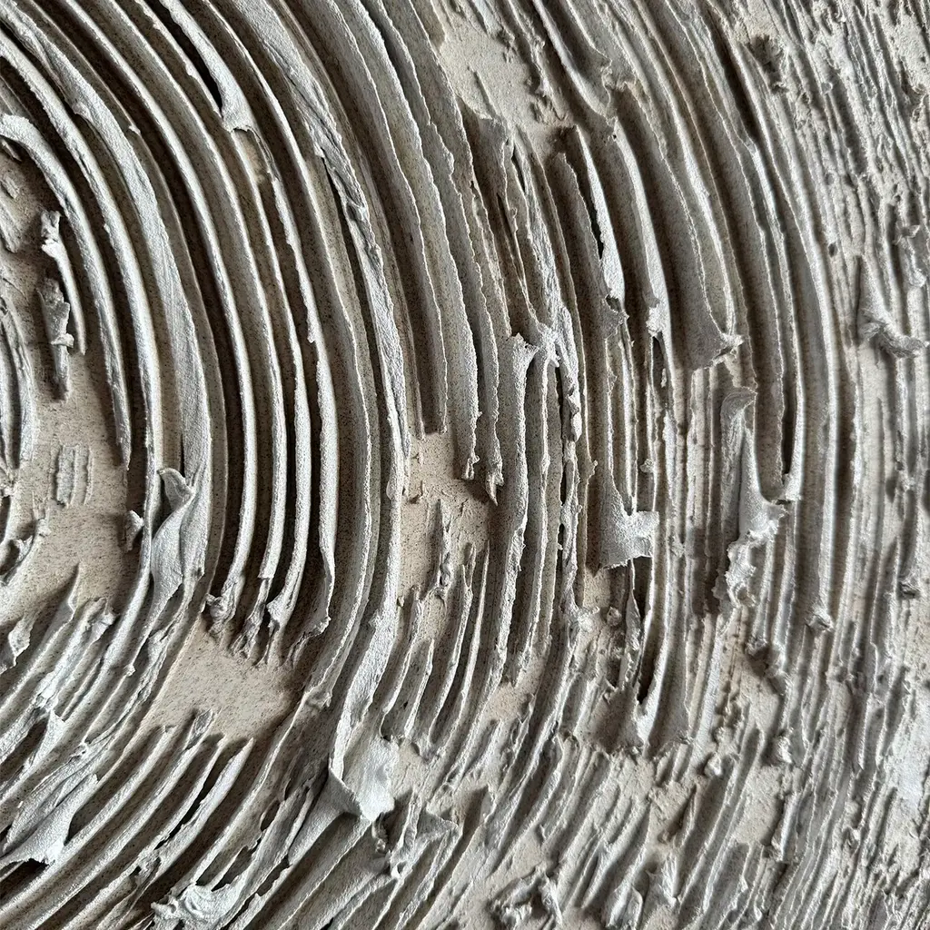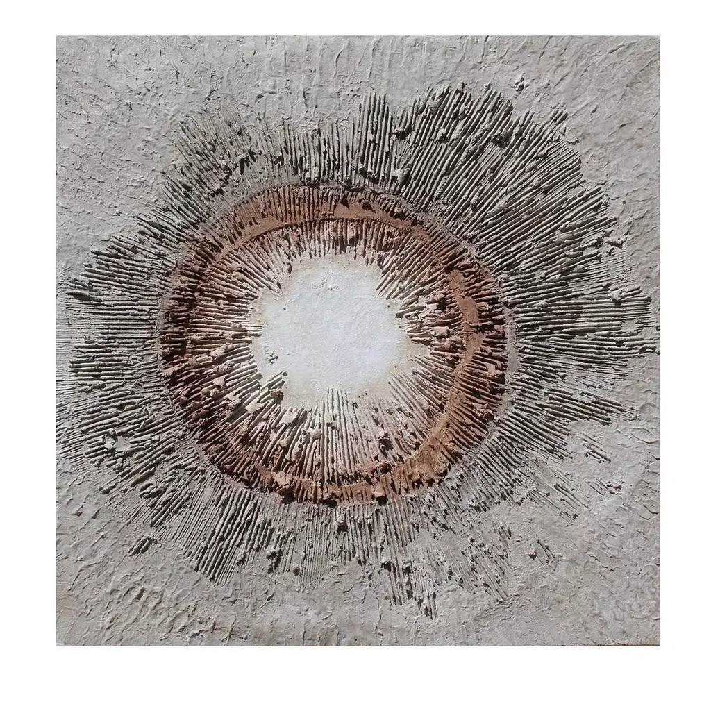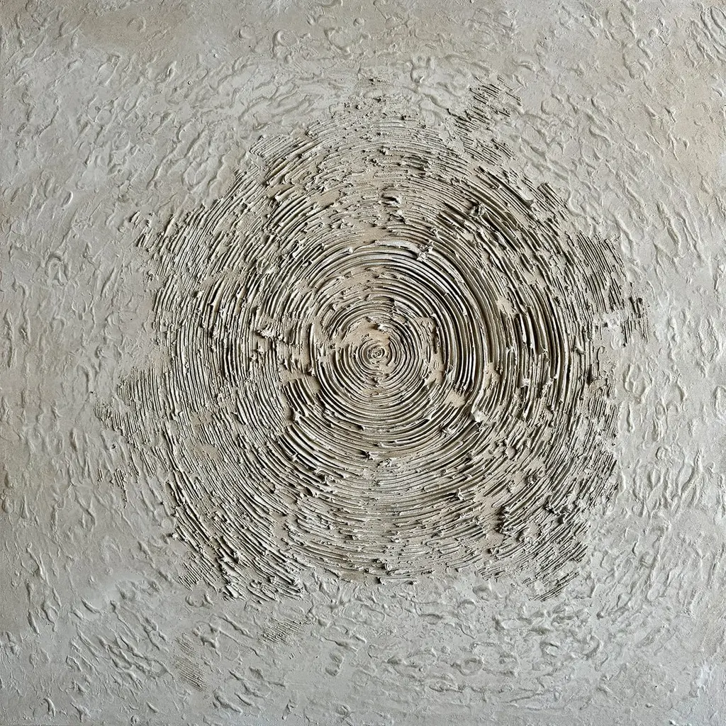 Defined by a striking interplay of textures, this artwork evokes the mesmerizing effect of a circle fracturing outward into an infinite wave. Its white and sandy tones blend seamlessly, capturing the essence of expansive motion. Despite its static nature, the piece creates a compelling illusion of dynamic movement, engaging the viewer with its elegant and evolving visual rhythm. Crafted using a meticulous technique that accentuates the interplay of different textures. Each painting is unique.