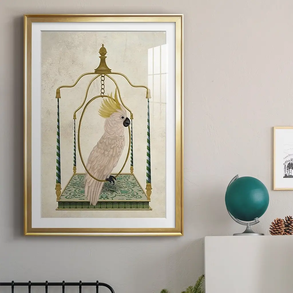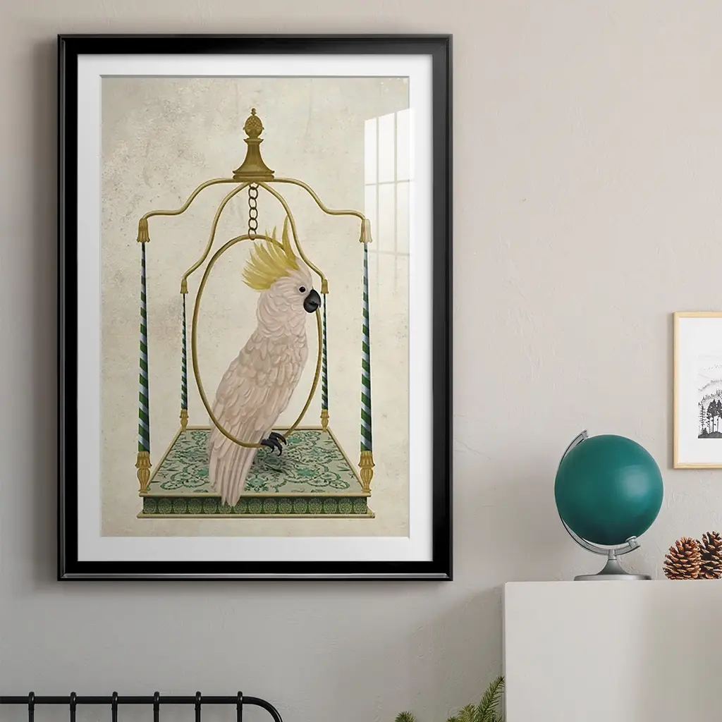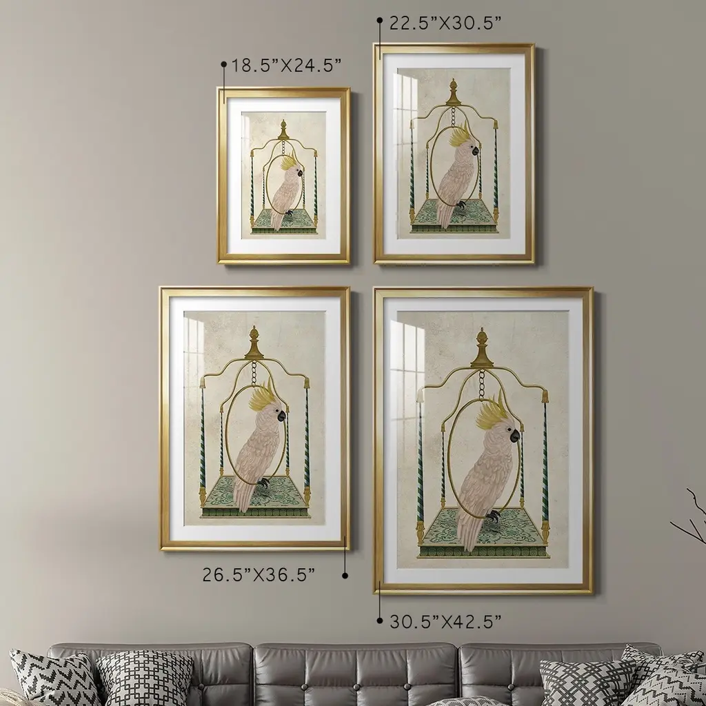 White Cockatoo on Swing Premium Framed Print - Ready to Hang A Premium Framed Print created to last. Framed in distressed wood and available in an array of sizes and colors Featuring a beveled a solid wood stretcher bar, each piece comes ready to hand 4 SIZES AVAILABLE 30.5''X42.5'' - Overall Size 26.5'X36.5'' - Overall Size 22.5''x30.5'' - Overall Size 18.5''x24.5'' - Overall Size Each piece is made to order. Each piece comes with hanging hardware. Made in the USA Ready to Hang Giclee Paper Print Acrylic Glass Beveled Matt Board