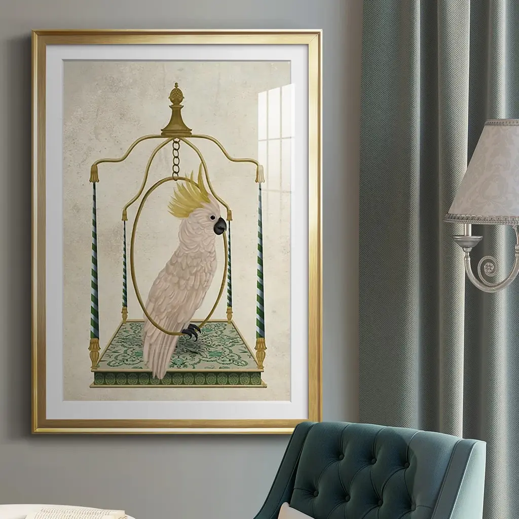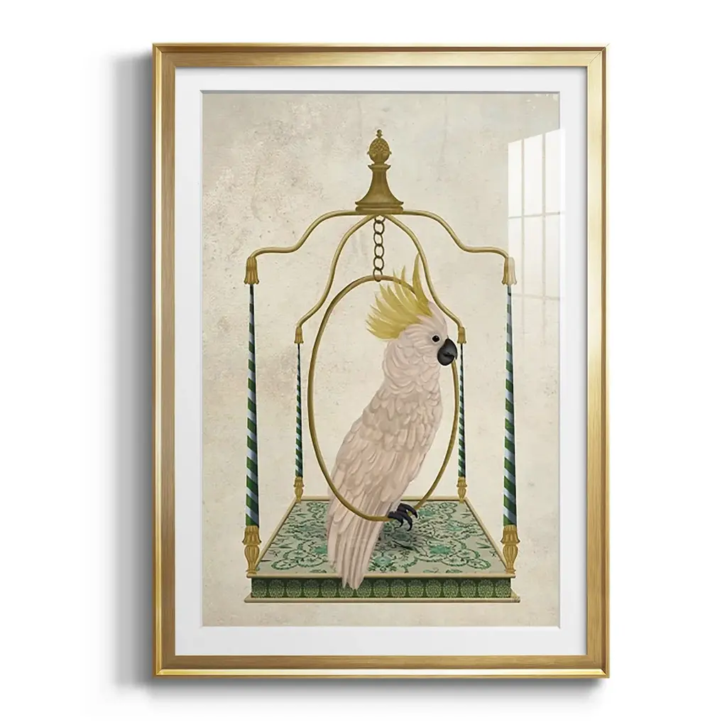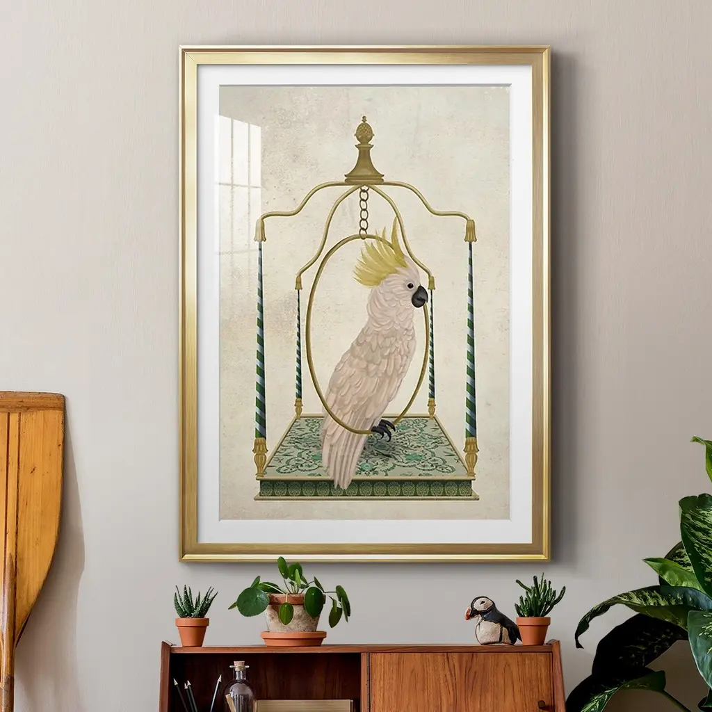 White Cockatoo on Swing Premium Framed Print - Ready to Hang A Premium Framed Print created to last. Framed in distressed wood and available in an array of sizes and colors Featuring a beveled a solid wood stretcher bar, each piece comes ready to hand 4 SIZES AVAILABLE 30.5''X42.5'' - Overall Size 26.5'X36.5'' - Overall Size 22.5''x30.5'' - Overall Size 18.5''x24.5'' - Overall Size Each piece is made to order. Each piece comes with hanging hardware. Made in the USA Ready to Hang Giclee Paper Print Acrylic Glass Beveled Matt Board