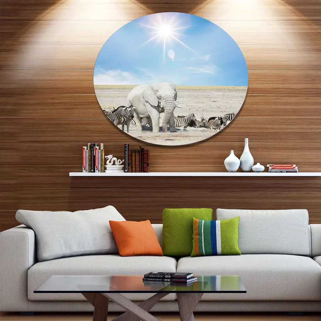 White Elephant And Herd Of Zebras, Animal Round Metal Wall Art, 11"