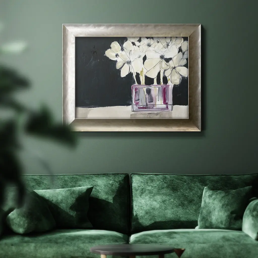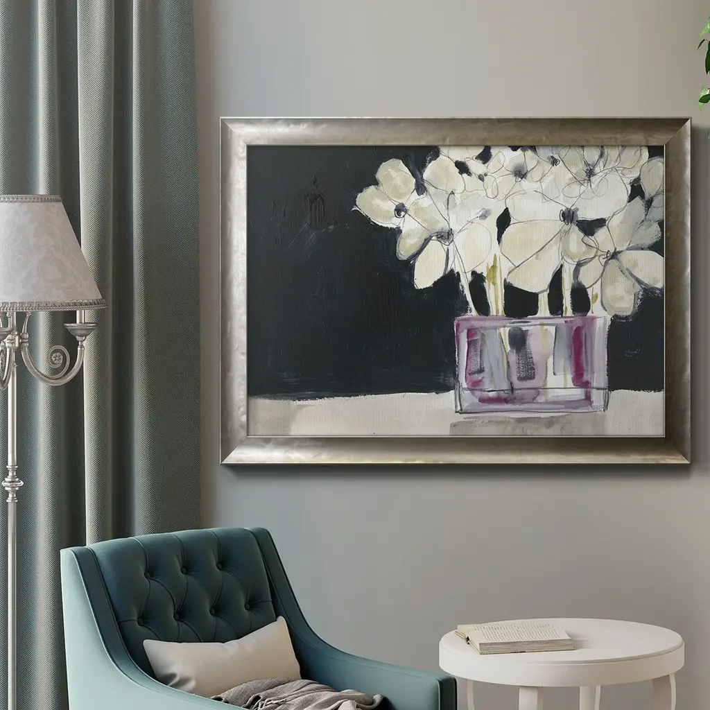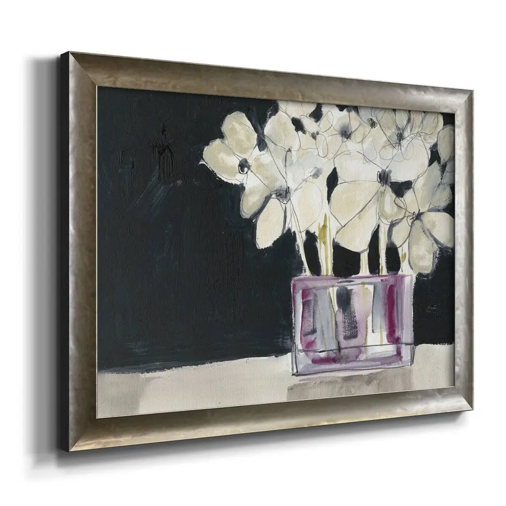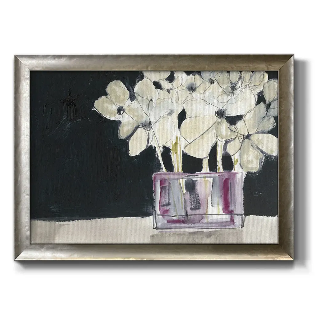 White Flowers in Fuchsia I Premium Framed Canvas- Ready to Hang A Premium Framed Canvas created to last. Framed in distressed wood and available in an array of sizes and colors Featuring a beveled a solid wood stretcher bar, each piece comes ready to hand 3 SIZES AVAILABLE 16''X20'' - Overall Size 18'X27'' - Overall Size 24''x36'' - Overall Size Each piece is made to order. Each piece comes with hanging hardware. Made in the USA Ready to Hang Giclee Paper Print Acrylic Glass Beveled Matt Board