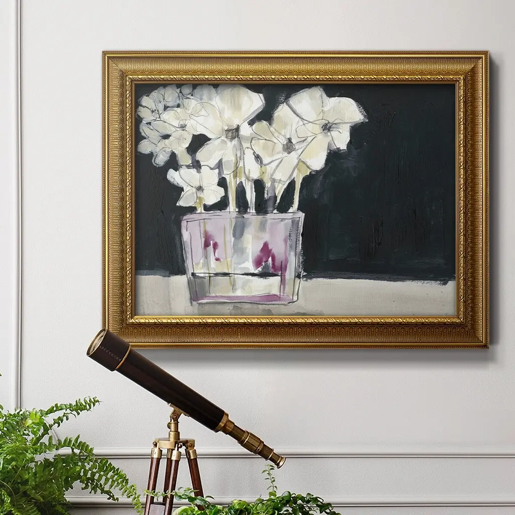 White Flowers in Fuchsia II Premium Framed Canvas- Ready to Hang A Premium Framed Canvas created to last. Framed in distressed wood and available in an array of sizes and colors Featuring a beveled a solid wood stretcher bar, each piece comes ready to hand 3 SIZES AVAILABLE 16''X20'' - Overall Size 18'X27'' - Overall Size 24''x36'' - Overall Size Each piece is made to order. Each piece comes with hanging hardware. Made in the USA Ready to Hang Giclee Paper Print Acrylic Glass Beveled Matt Board