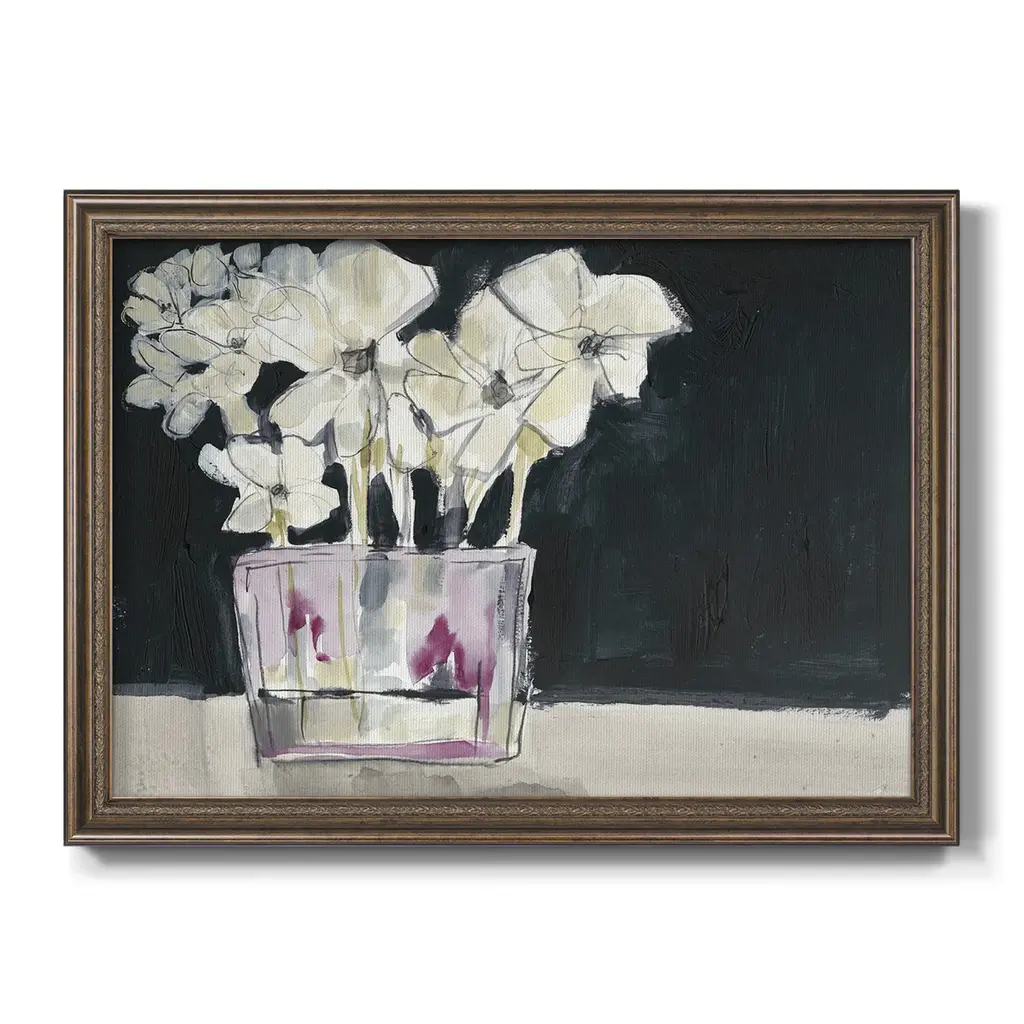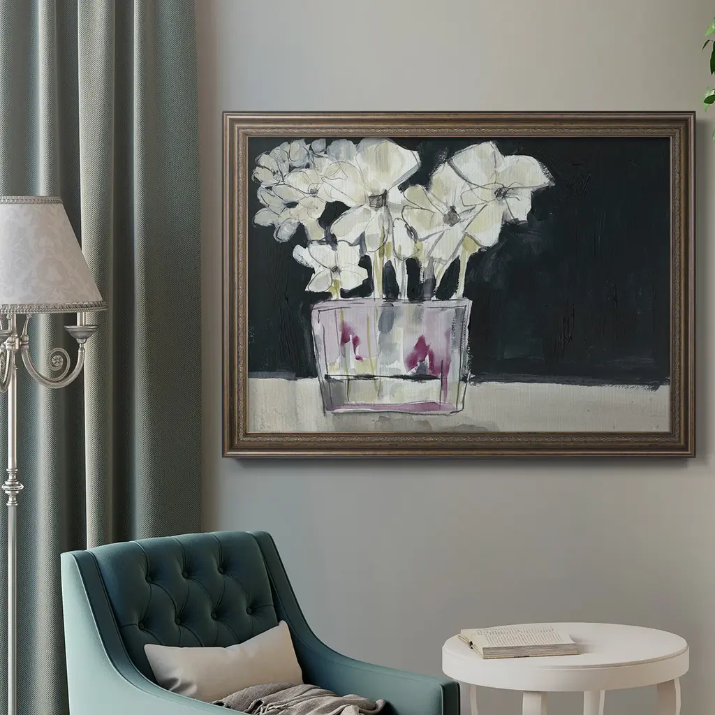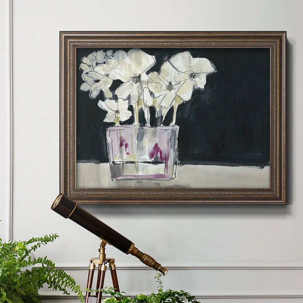 White Flowers in Fuchsia II Premium Framed Canvas- Ready to Hang A Premium Framed Canvas created to last. Framed in distressed wood and available in an array of sizes and colors Featuring a beveled a solid wood stretcher bar, each piece comes ready to hand 3 SIZES AVAILABLE 16''X20'' - Overall Size 18'X27'' - Overall Size 24''x36'' - Overall Size Each piece is made to order. Each piece comes with hanging hardware. Made in the USA Ready to Hang Giclee Paper Print Acrylic Glass Beveled Matt Board