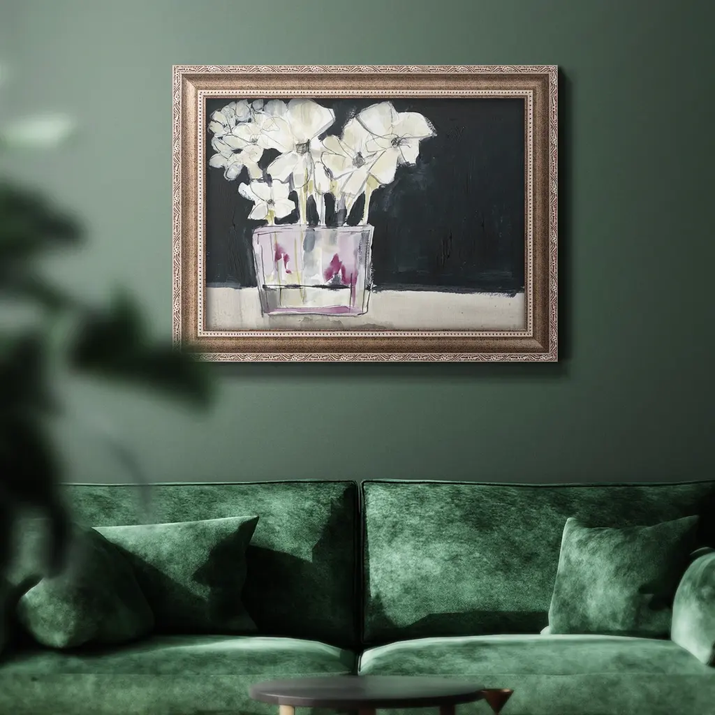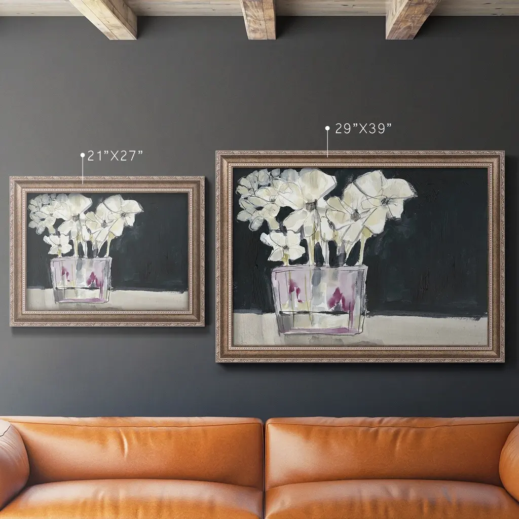 White Flowers in Fuchsia II Premium Framed Canvas- Ready to Hang A Premium Framed Canvas created to last. Framed in distressed wood and available in an array of sizes and colors Featuring a beveled a solid wood stretcher bar, each piece comes ready to hand 3 SIZES AVAILABLE 16''X20'' - Overall Size 18'X27'' - Overall Size 24''x36'' - Overall Size Each piece is made to order. Each piece comes with hanging hardware. Made in the USA Ready to Hang Giclee Paper Print Acrylic Glass Beveled Matt Board