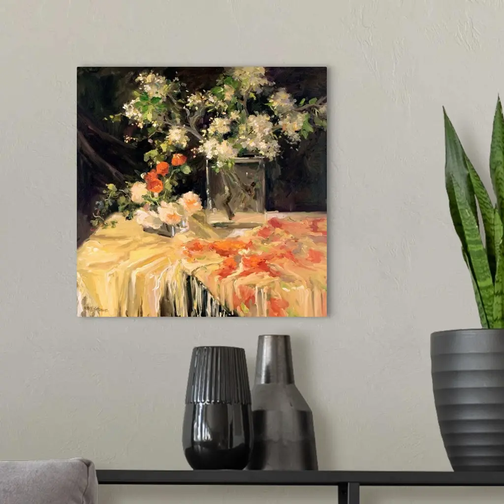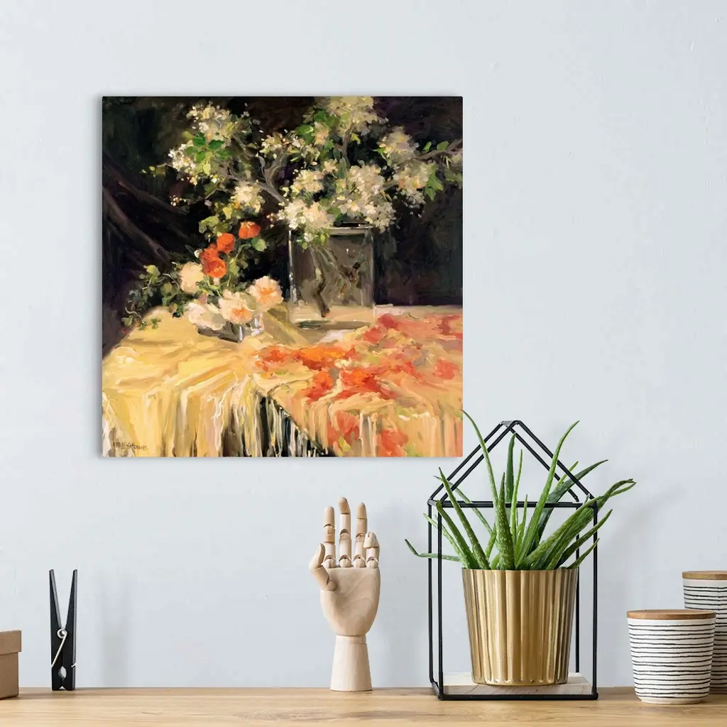 Contemporary still life painting of a beautiful shawl covered table and a vase filled with flowering white freesia.