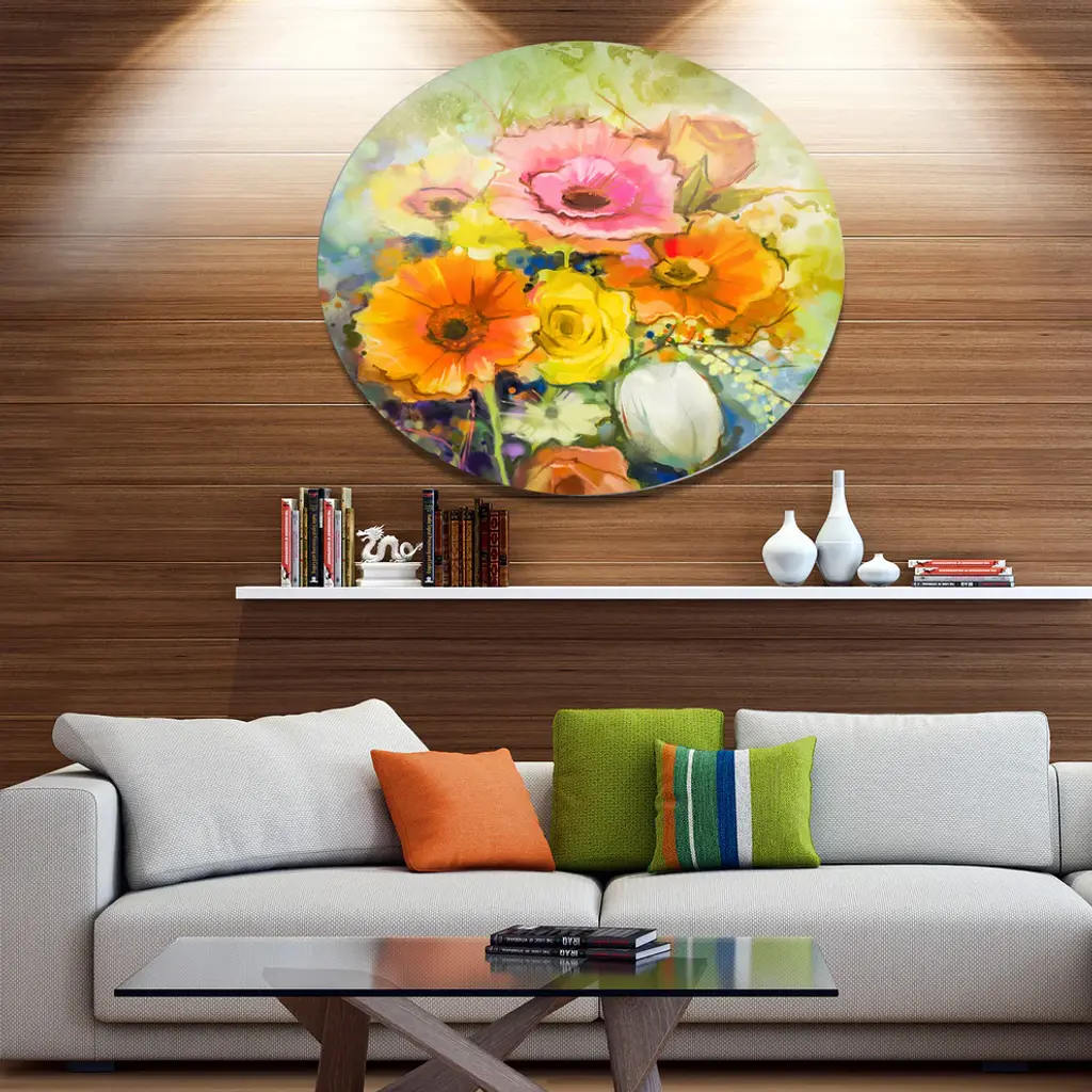 White Gerbera Red Rose And Tulips, Flower Large Disc Metal Artwork, 11"