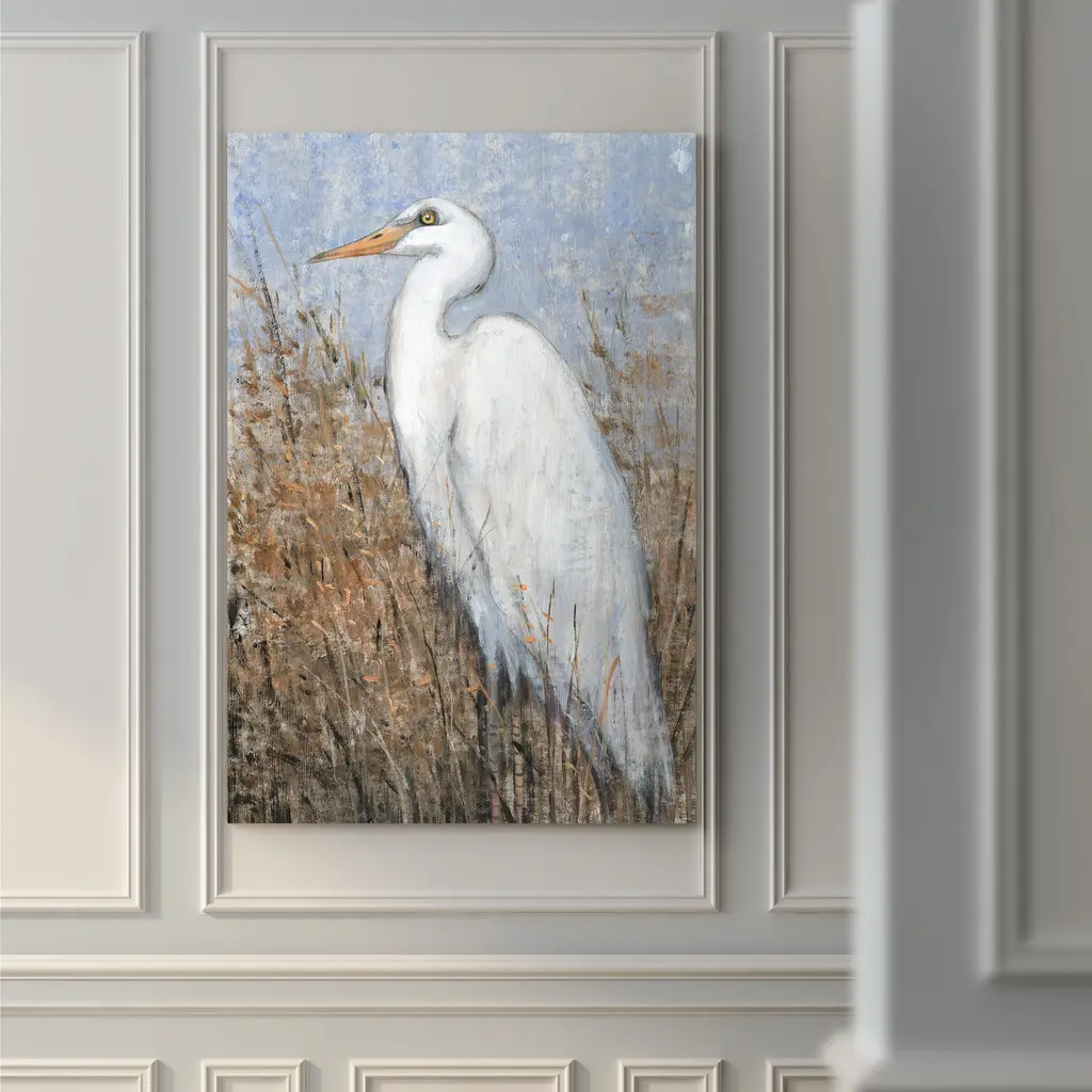 White Heron II -Premium Gallery Wrapped Canvas - Ready to Hang A premium hand stretched gallery wrapped canvas print created to last. Featuring a beveled a solid wood stretcher bar, each piece comes ready to hand 5 SIZES AVAILABLE 8''X12'' - Overall Size 16''x20'' - Overall Size 18''x27'' - Overall Size 24''x36'' - Overall Size 32''x48'' - Overall Size Each piece is made to order. Built to Last Each piece comes ready to hang Solid wood stretcher Fade and Water resistant Made domestically