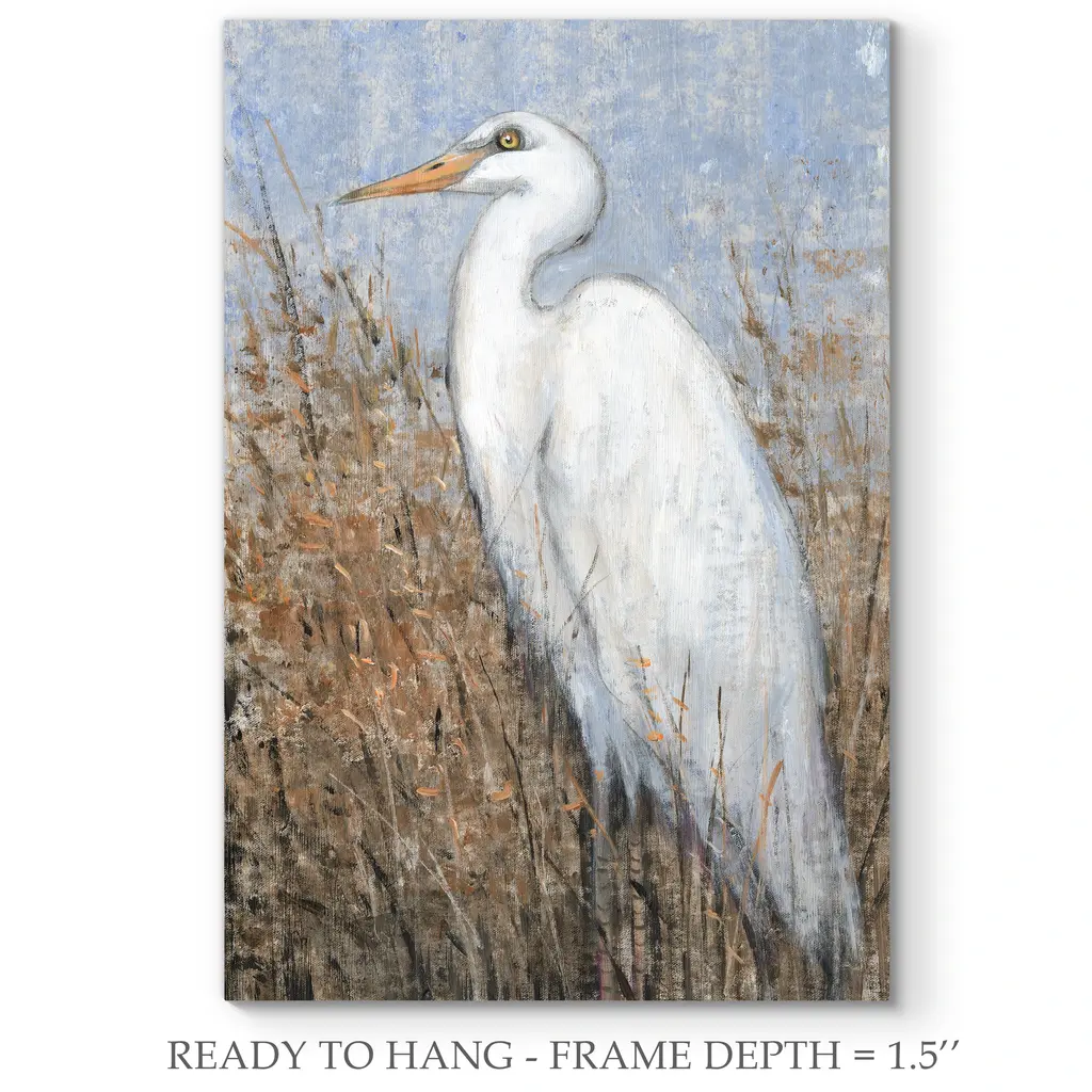 White Heron II -Premium Gallery Wrapped Canvas - Ready to Hang A premium hand stretched gallery wrapped canvas print created to last. Featuring a beveled a solid wood stretcher bar, each piece comes ready to hand 5 SIZES AVAILABLE 8''X12'' - Overall Size 16''x20'' - Overall Size 18''x27'' - Overall Size 24''x36'' - Overall Size 32''x48'' - Overall Size Each piece is made to order. Built to Last Each piece comes ready to hang Solid wood stretcher Fade and Water resistant Made domestically