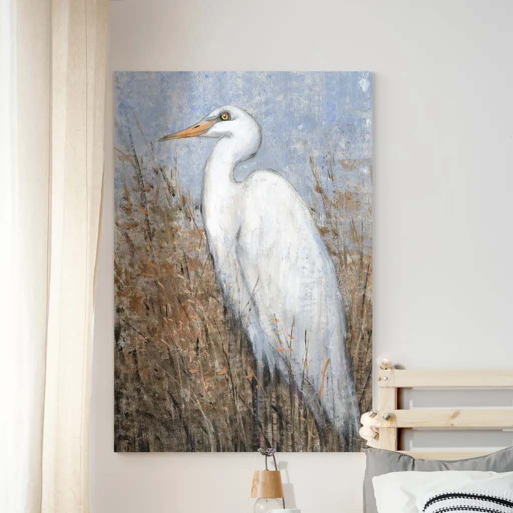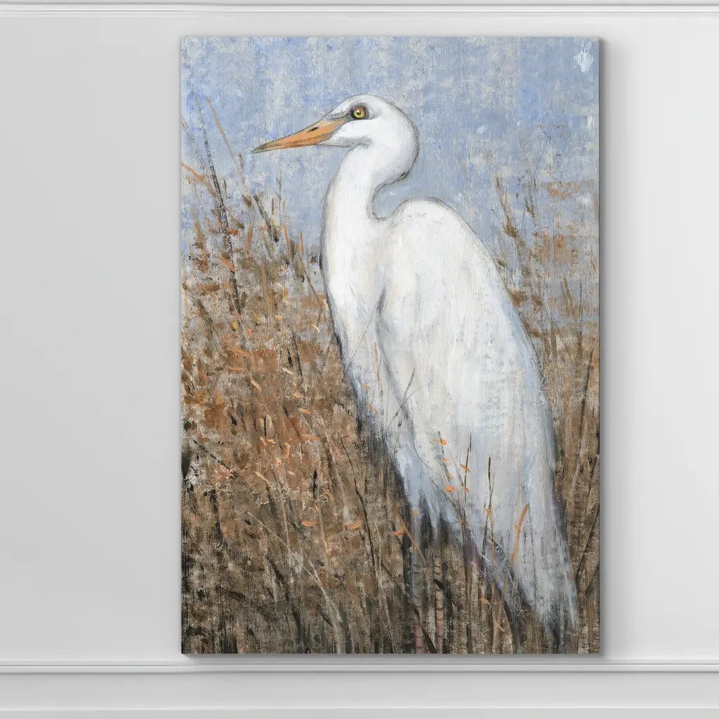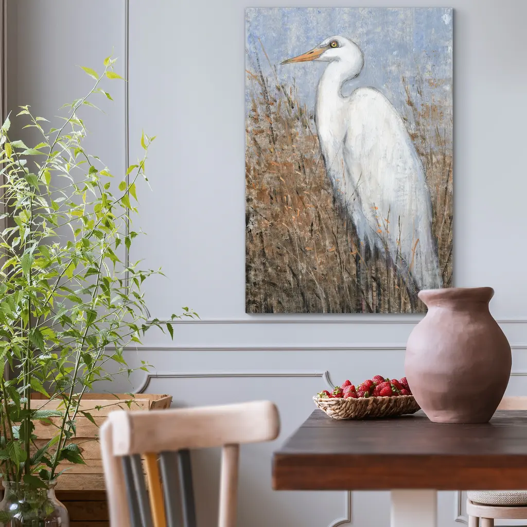 White Heron II -Premium Gallery Wrapped Canvas - Ready to Hang A premium hand stretched gallery wrapped canvas print created to last. Featuring a beveled a solid wood stretcher bar, each piece comes ready to hand 5 SIZES AVAILABLE 8''X12'' - Overall Size 16''x20'' - Overall Size 18''x27'' - Overall Size 24''x36'' - Overall Size 32''x48'' - Overall Size Each piece is made to order. Built to Last Each piece comes ready to hang Solid wood stretcher Fade and Water resistant Made domestically