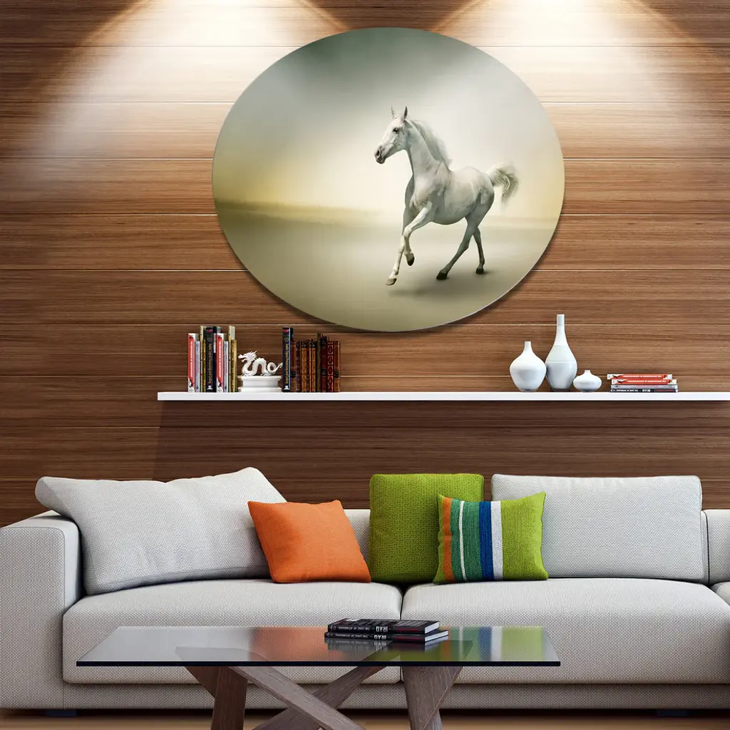 Bring Contemporary Abstraction to your home with this large Circle Metal wall art. This White Horse in Motion Metal Artwork makes it the focal point of any room or office. - White Gloss Coating ensures colors are extra vibrant with light reflection.- Aluminum grade Sheet Metal with 1 inch mounting frame on the back giving the illusion that the artwork is floating on the wall..- Mounting Brackets are included along with instructions.- High Quality Digital images are created directly into a glossy aluminum panel producing a stunning and captivating print into the glossy finish of the metal.- Water, Fire and Scratch resistant HD Aluminum panels.- Looks better than any photo paper and guaranteed to last at least 20 years- Easy to clean with a microfiber cloth. Colors are far superior to regular Canvas Art. - Easy to Hang
