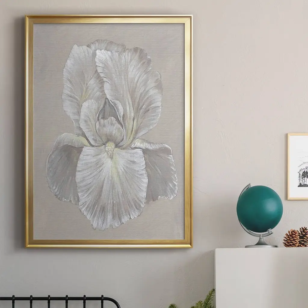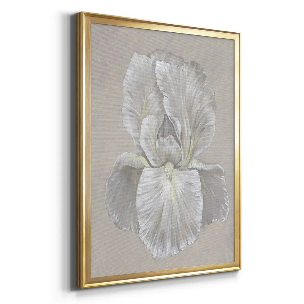 White Iris I Premium Framed Print - Ready to Hang A Premium Framed Print created to last. Framed in distressed wood and available in an array of sizes and colors Featuring a beveled a solid wood stretcher bar, each piece comes ready to hand 4 SIZES AVAILABLE 30.5''X42.5'' - Overall Size 26.5'X36.5'' - Overall Size 22.5''x30.5'' - Overall Size 18.5''x24.5'' - Overall Size Each piece is made to order. Each piece comes with hanging hardware. Made in the USA Ready to Hang