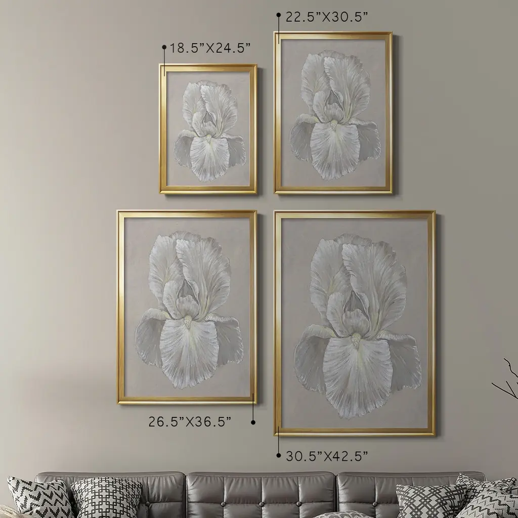 White Iris I Premium Framed Print - Ready to Hang A Premium Framed Print created to last. Framed in distressed wood and available in an array of sizes and colors Featuring a beveled a solid wood stretcher bar, each piece comes ready to hand 4 SIZES AVAILABLE 30.5''X42.5'' - Overall Size 26.5'X36.5'' - Overall Size 22.5''x30.5'' - Overall Size 18.5''x24.5'' - Overall Size Each piece is made to order. Each piece comes with hanging hardware. Made in the USA Ready to Hang