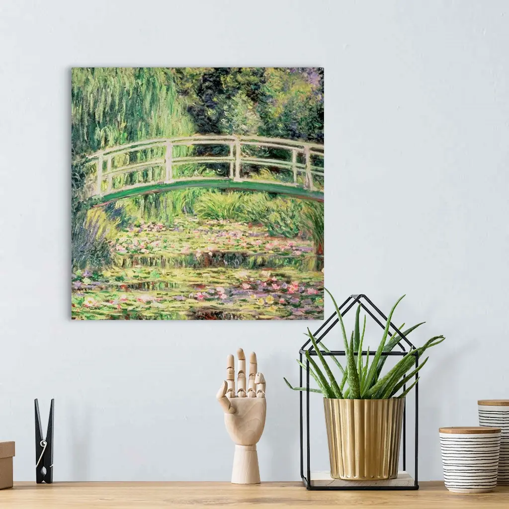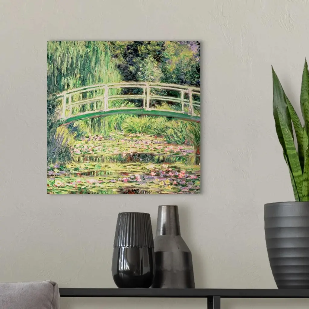 This classic artwork is a painting of a small walking bridge over water that is covered with lily pads and surrounded by trees.