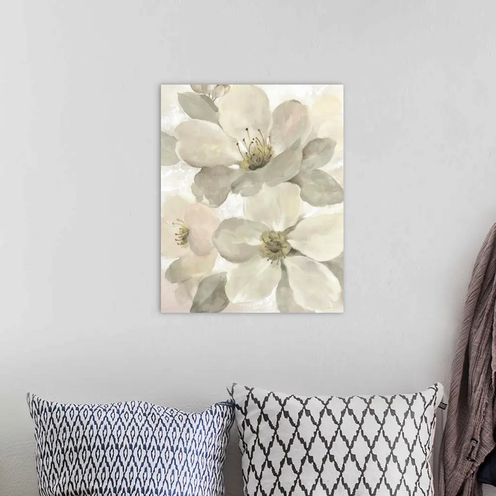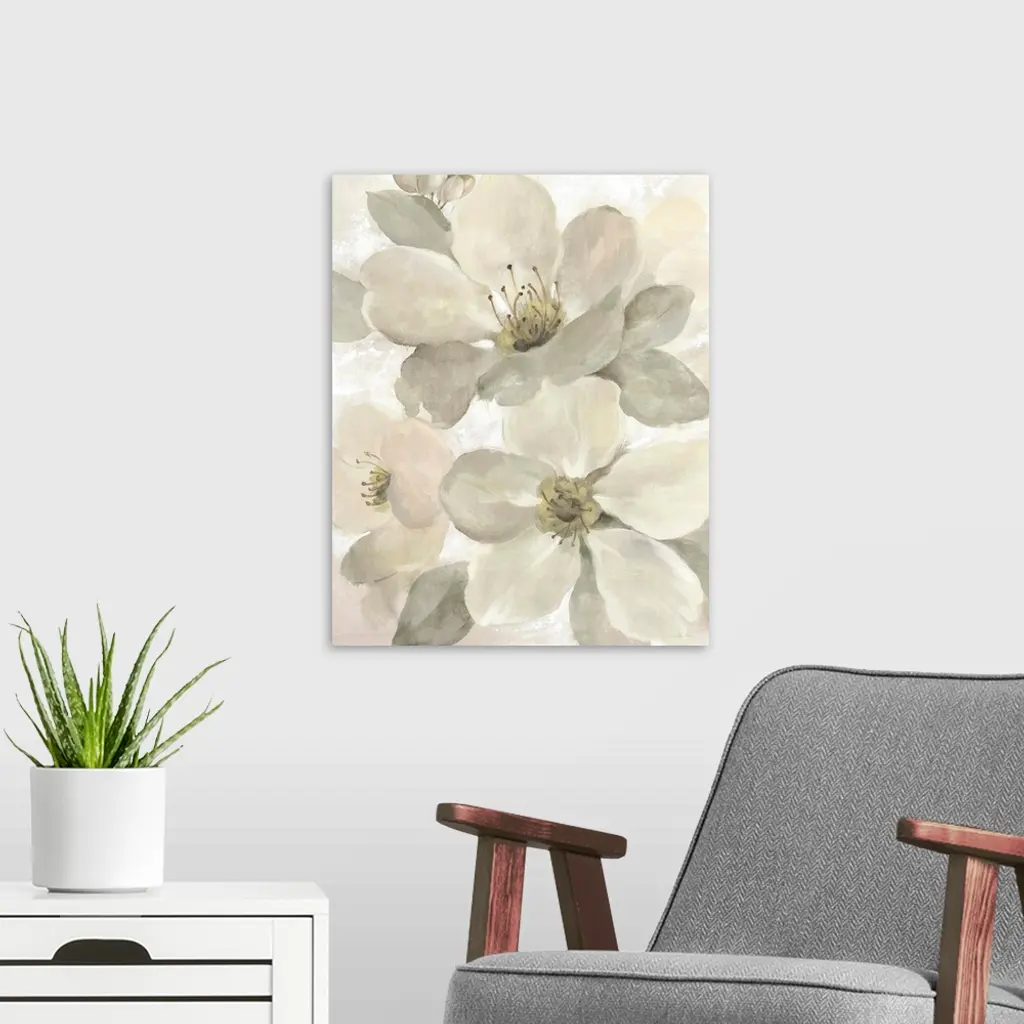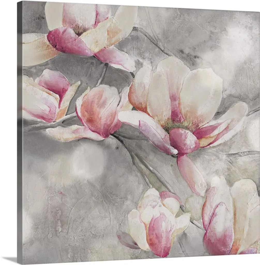 Contemporary painting of neutral toned magnolia flowers.