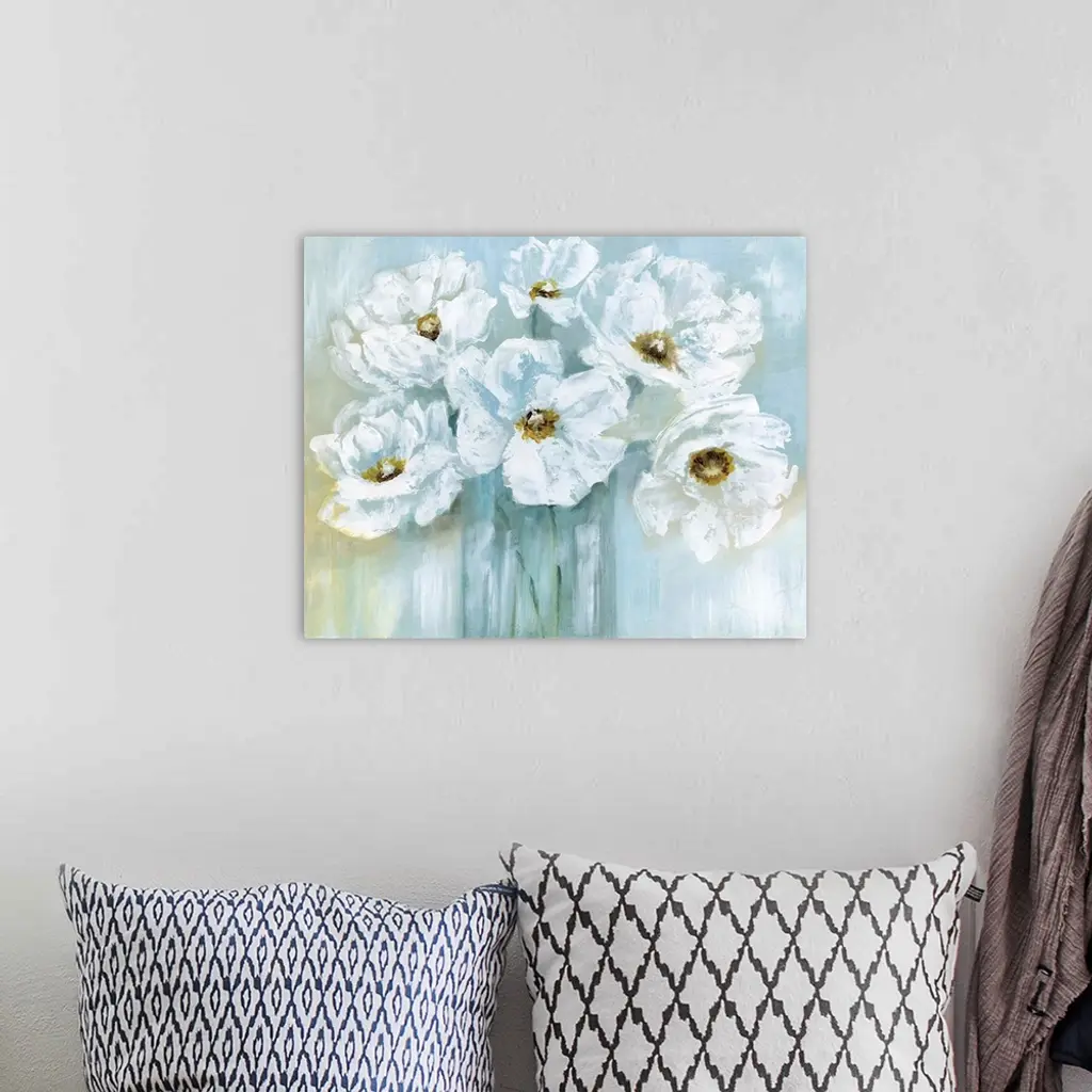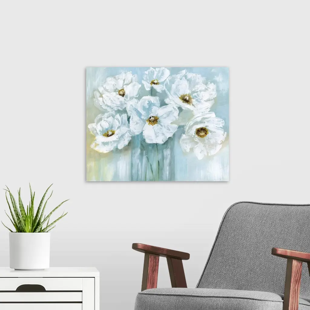 Contemporary painting of a bouquet of white poppy flowers with blue and gold tones.